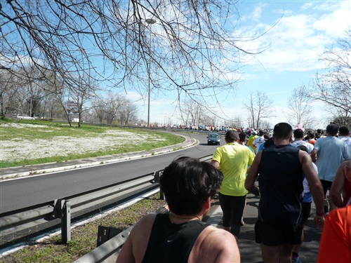 Schon seit den ersten km befinde ich mich im Pulk der 4 Stunden-Läufer. Einerseits ist das gut, weil ich mir über das Tempo keine Gedanken machen muss, andererseits ist es an den Verpflegungsstellen aber immer tierisch voll, weil sich die ganze Meute gleichzeitig auf die Tische stürzt. Ich mache das nicht gerne, aber wenn ich noch etwas bekommen will, muss ich schon mal die Ellenbogen ausfahren. Ich habe auch kaum eine Chance, von dem Pulk wegzukommen. Einerseits fürchte ich, zu früh zu überziehen und am Ende die Quittung zu bekommen, andererseits ist so viel Volk auf der Straße, dass ich nur mit sehr viel Einsatz vorbeikäme. Ich merke, dass mein letzter großer Stadtmarathon doch schon länger zurückliegt.
