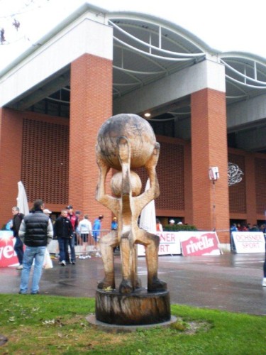 Beim Zieldurchlauf sind ein paar Zuschauer, die vorwiegend den Finishern des Halbmarathons zujubeln wollen, trotzdem auch für mich etwas Applaus entbehren können. Wenige Meter hinter der Linie wird es still und einsam, wie das auf der zweiten Runde halt so ist. Die beiden aus Holz geschnitzten Kumpels nach dem schönen Rundbau des Sportzentrums werden auch nicht mitkommen. Es sind die Maskottchen, die seit der letzten EM an diesem Platz stehen, weil das Centro Sportivo damals hohen fußballerischen Besuch hatte. Jogis Jungs haben sich auf diesem Gelände den letzten Schliff für jene Meisterschaft geholt. Ich hole mir heute den letzten Schliff für meinen ersten Waffenlauf am kommenden Sonntag.