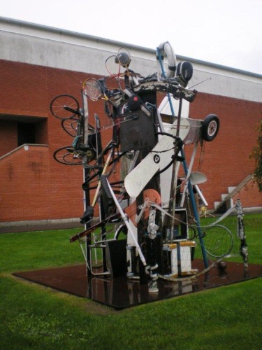 An leeren Feldern und Foliengewächshäusern vorbei geht es weiter. Vor einem weiteren Sportplatz laufen wir auf einer kleinen Piazza an einer interessanten Skulptur aus Granit vorbei, deren tiefere Botschaft mir verborgen bleibt, von meinem Ästhetikempfinden trotzdem wohlwollend beurteilt wird.