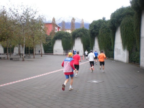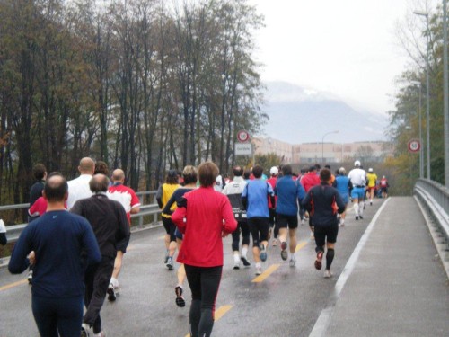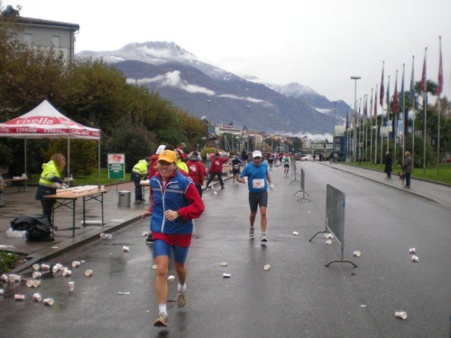 Ein Kilometerschild und bald darauf das Ende der Uferpromenade machen klar, dass in wenigen Minuten die Hälfte des Vergnügens um sein wird. Am nächsten Verpflegungsposten können sich die Mezzo-Maratonisti den letzten Kick für den Zieleinlauf holen, meinesgleichen bereitet sich auf den zweiten Durchlauf vor.