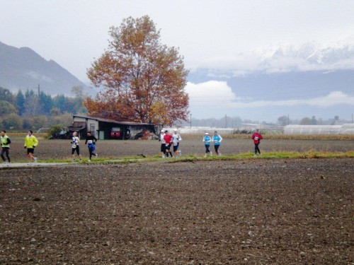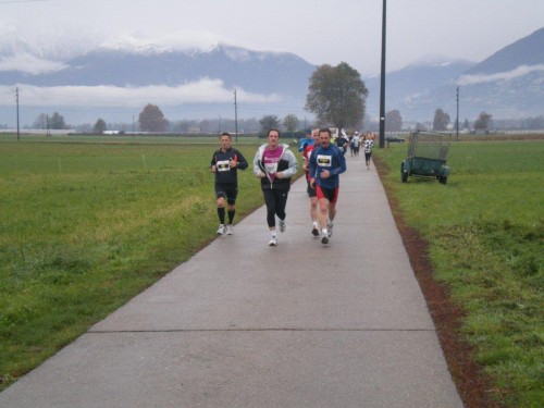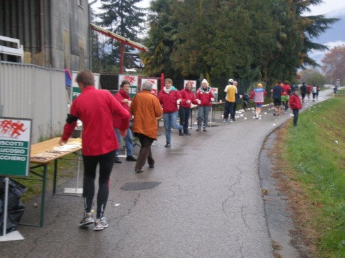 Nach etwa fünf Kilometern dreht die Strecke und folgt der Bahnlinie zurück nach Tenero. Ein Blick zurück über den brachen Acker zeigt mir, dass hinter mir nicht noch viele Läufer folgen. Der Blick nach vorne zeigt den ersten der alle fünf Kilometer eingerichteten Verpflegungsposten. An jedem gibt es das komplette Angebot, welches Riegel, Früchte, Wasser, Tee, Rivella und das isotonische, magenverträgliche Rivella-Marathon beeinhaltet, mit gut lesbaren Schildern angekündigt ist und von vorwiegend jugendlichen Helferinnen und Helfern gereicht wird. Ich halte mich heute ausschließlich an das angenehm gewärmte Iso und damit ist mir bis zum Schluss bestens gedient.