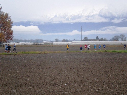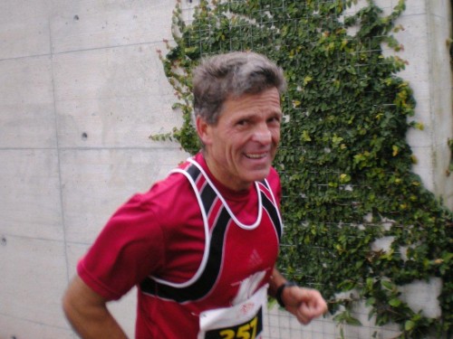 In diesem Bereich preschen auch die Schnellsten aus der zweiten Halbmarathon-Startgruppe an mir vorbei, ein zweifelhaftes Vergnügen, das noch mehrere Kilometer andauert, bis sich auch die dritte und vierte Gruppe auf der Piste verteilt hat. Ich habe das Gefühl, dass ich gleichmäßig und in einem für mich mittleren Tempo unterwegs bin, trotzdem kann ich mich des Eindruck nicht erwehren, dass ich kaum vom Fleck komme. Ich muss mich anhand der Uhr und des Pulsmessers kalibrieren und merke, dass die Überholmanöver der schnellen Halben meine Eigenwahrnehmung für einen Moment gestört haben. Dennoch muss ich sagen, dass es Angenehmeres gibt, als einen nach dem anderen vorbeiziehen zu sehen, obwohl ich eigentlich fit und munter am Traben bin. Wenigstens ist dies schon jetzt der Fall und nicht auf der zweiten Runde, sonst könnte auch ich die Krise bekommen (und Gnade dem, der sich auf der ersten Runde schon übernommen hat…).