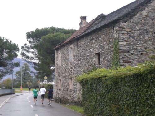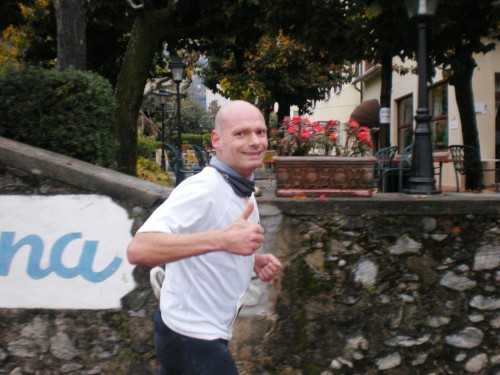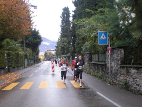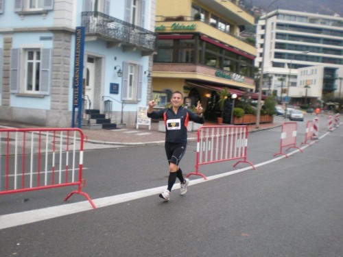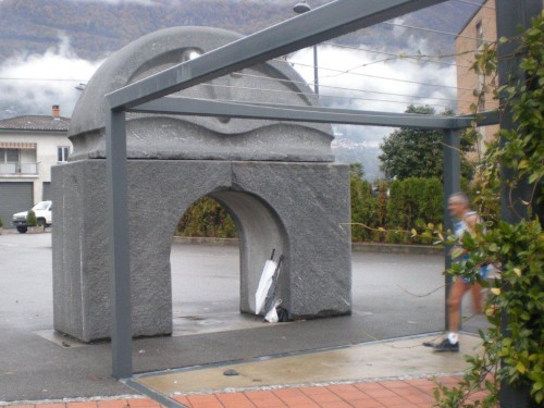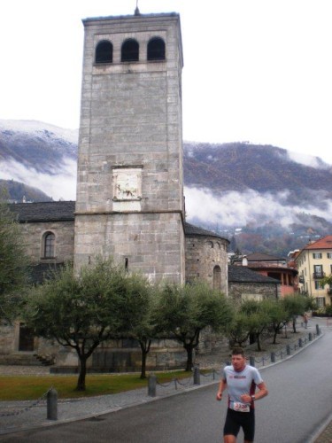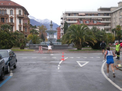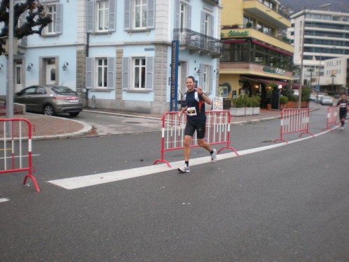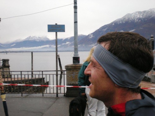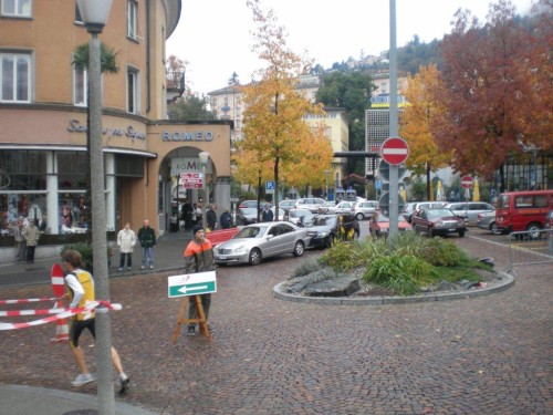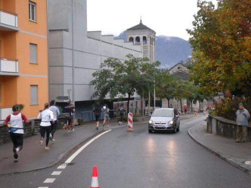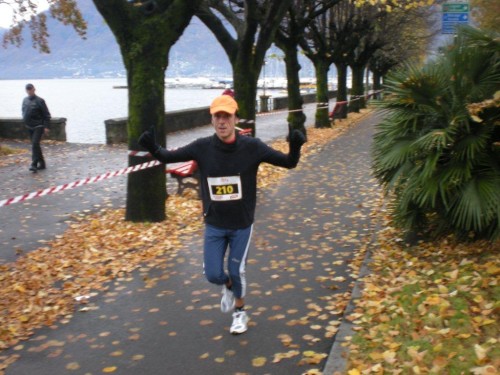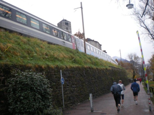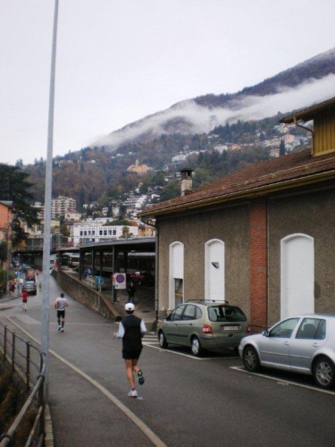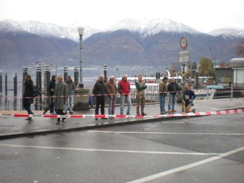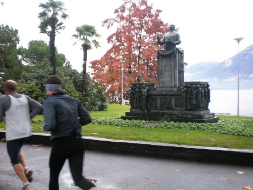 Die Grundsteine der Basilika sind jünger als Pheidippides, aber auch schon älteren Datums. An dieser Stelle stand zu Römerzeiten ein dem Bacchus geweihter Tempel. Die Römer müssen ja zünftig Ramba Zamba gemacht haben, dass sie dafür sogar eine Gottheit kreierten… (Genau genommen haben sie zwar nur den Dionysos rezykliert). Ich hingegen laufe völlig nüchtern weiter. Oder meine ich das bloß, weil ich einen so konstant hohen Endorphinpegel habe und es gar nicht mehr merke? Dafür spricht, dass es mir nichts ausmacht, dass sich am Streckenrand nur vereinzelt Zuschauer einfinden und wir von daher wenig äußeren Antrieb haben. Es läuft einfach – hinunter nach Locarno, hinter dem Bahnhof durch, weiter zum See und von dort auf einer Schlaufe durch die Stadt. Beim Grandcasino ist wieder ein Verpflegungsposten. Nein, les jeux ne sont pas encore faits! Ich komme nachher nochmals vorbei, es hätte sich sonst nicht gelohnt, die Schnürsenkel zu binden.