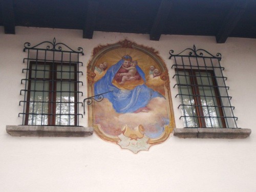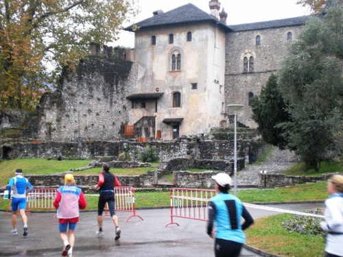 In der Zwischenzeit hat sich das gesamte Feld so eingependelt, dass ich bei gleichbleibendem Tempo immer wieder andere Läufer überhole. Bei meinen Fotostopps ziehen sie wieder an mir vorbei, und wenn ich sie wieder eingeholt habe, stehe ich sicher wieder vor einem Fotomotiv. Zuerst ist es die Kirche San Quirico mit ihren Fresken aus dem 13. – 16. Jahrhundert, dann die Cà di Ferro (das eiserne Haus), ein Bau, der auf die zweite Hälfte des 16. Jahrhunderts zurückgeht und als Warenlager und Kaserne für angeworbene Söldner diente. Merkmale sind die vergitterten Fensteröffnungen, zahlreiche Kamine und ein Fresko der Madonna an der Fassade. Zum Baukomplex gehört auch eineBarockkapelle; alles zusammen wäre eine Besichtigung wert, was leider auch nach dem Marathon nicht möglich ist, da es sich heute um einen privaten Wohnsitz handelt. Schade, dass es Leute gibt, die ihre persönlichen Interessen über das öffentliche Interesse an Kulturgütern stellen.