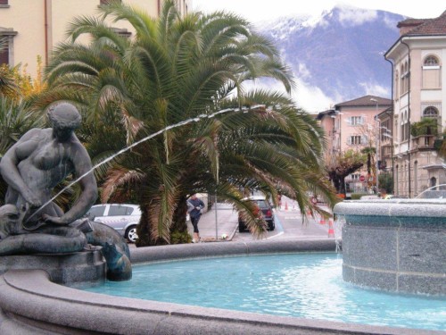 Ein paar Straßenstücke zum Distanz-Sammeln und dann sind wir beim Castello der Visconti und allen den dazugehörenden Mauerresten des mittelalterlichen Hafens, die zu einem Großteil in einer Straßenunterführung liegen. Ein überdimensionierter Kreisverkehr bildet den Ring um die Piazza Castello, die mit ihrem Durchmesser von 134 m den Fußgängern und Radfahrern ein ungestörtes Weiterkommen in diesem Bereich ermöglicht. Wir umkreisen den Platz zu drei Vierteln und werden durch eine weitere, etwas enge Unterführung zur Piazza Pedrazzini mit ihrem schönen alten Brunnen und zurück zum See geleitet.