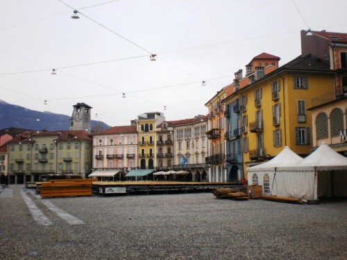 Die Altstadt mit der Piazza Grande streifen wir nur. Für einen Schnappschuss reicht es aber trotzdem, nur ist der Blick auf das Häuserensemble rund um die Piazza wieder von Podesten beeinträchtigt. Dieser Kopfsteinpflasterplatz ist immer wieder Zentrum hochwertiger kultureller Anlässe. Hier werden bei den Filmfestspielen die Wettbewerbsbeiträge gezeigt, deren bester mit dem Goldenen Leoparden ausgezeichnet wird. Ganz so flink, schnell und wendig wie die Raubkatze fühle ich mich nun doch nicht, ich würde mich eher den Garfields zuordnen und finde es deshalb nicht unpassend, dass wir nicht über den Platz geführt werden.