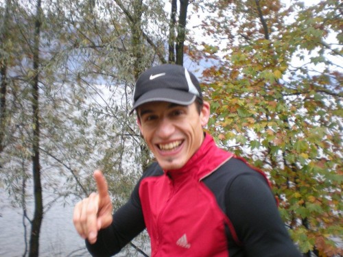 Beim Aufwachen nimmt es mich natürlich wunder, wie feucht es draußen zugeht. Ich schiebe die Vorhänge beiseite und reibe mir kräftig die Augen. Nein, der Schlummertrunk kann es nicht sein, sonst hätte ich nicht so friedlich geschlafen und jetzt nicht einen so klaren Kopf. Ich traue meinen Augen nicht: Die Berge am anderen Ufer sind bis weit hinunter weiß, über Nacht überzuckert und ins Winterkleid gesteckt. Nebelschwaden hängen tief an den Bergflanken und der Übergang der Gipfel in die Wolken ist nahtlos. Was Schnee ist und was Nebel, ist nicht deutlich erkennbar. Doch der große Schub Feuchtigkeit scheint in der Nacht gefallen zu sein. Wenn es bei den Tropfen bleibt, welche die Oberfläche der Pfützen in Bewegung halten, wird das ganz passables Laufwetter.