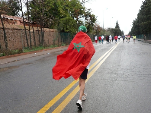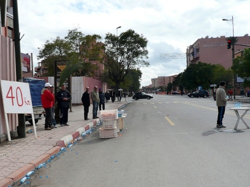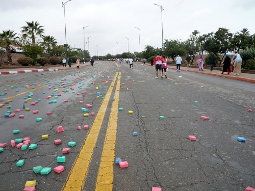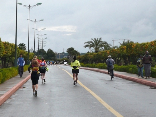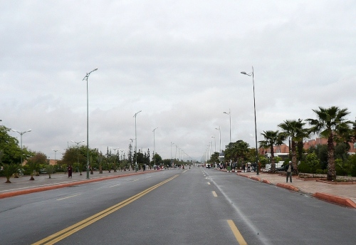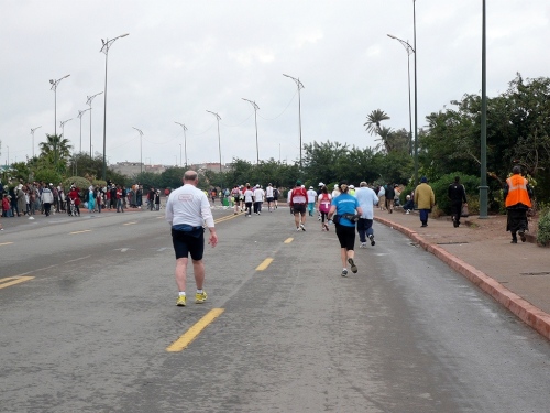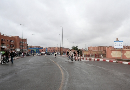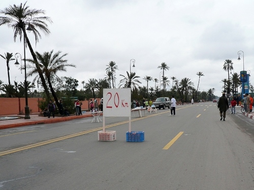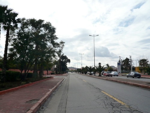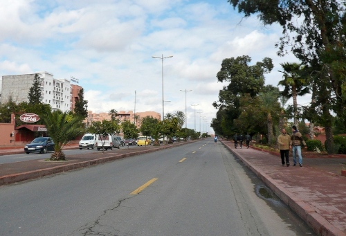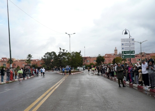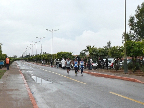 Nach einigen Tankstellen und Hotels kommen langsam die ersten Wohnquartiere. Zuschauer gibt es hier kaum, dafür viele hupende Autos. Die Polizisten halten unsere Fahrspur frei und wenn einer auf unsere Spur kommt, wird er energisch zurückgepfiffen. Der Boulevard Abdelkrim Al Khattabi ist leicht ansteigend und kommt mir ebenfalls unendlich vor. 8km, dann sind wir kurz vor den Bahnhof und gleich am Königlichen Theater, am Park und am Stadion El Hardi vorbei.