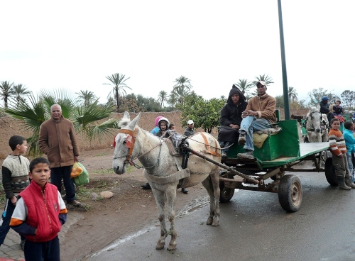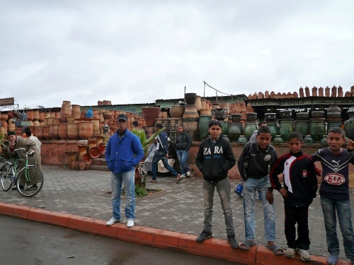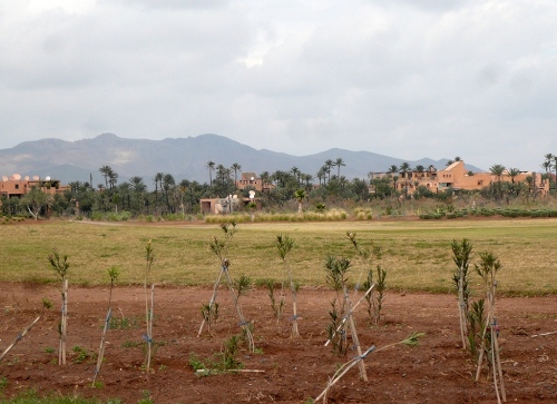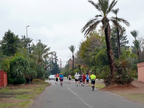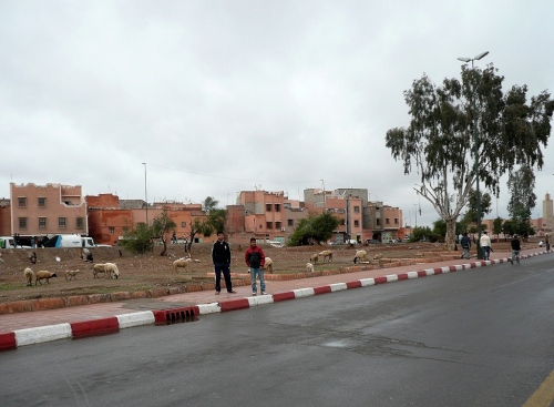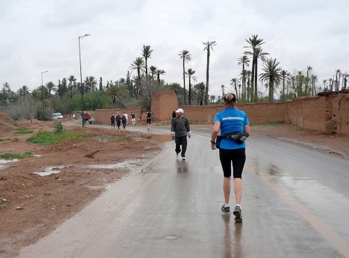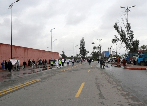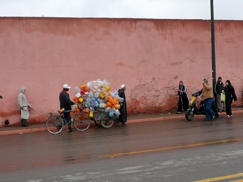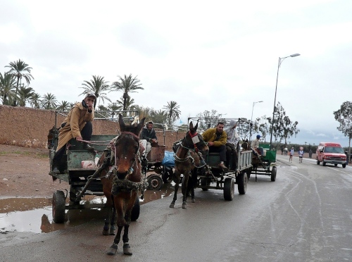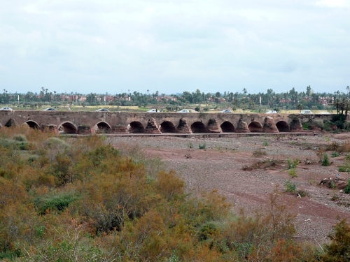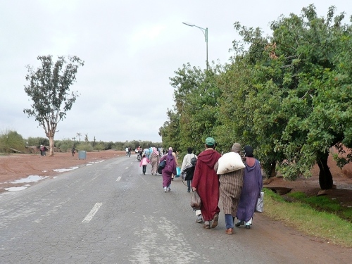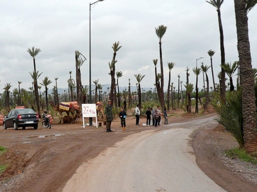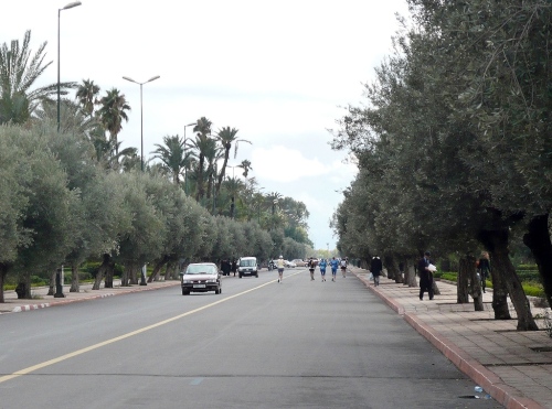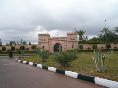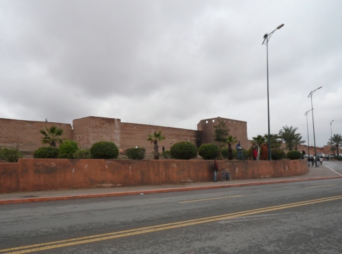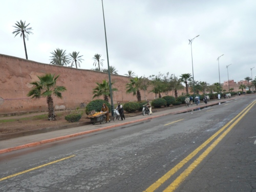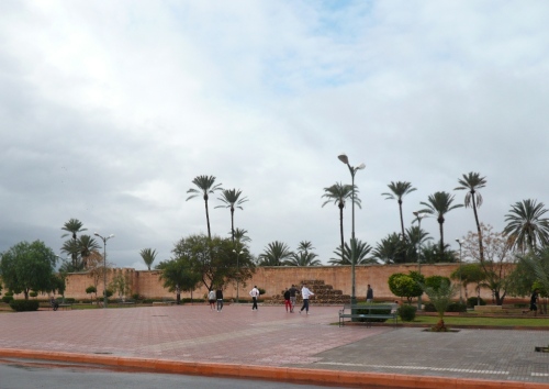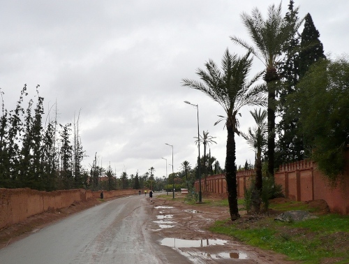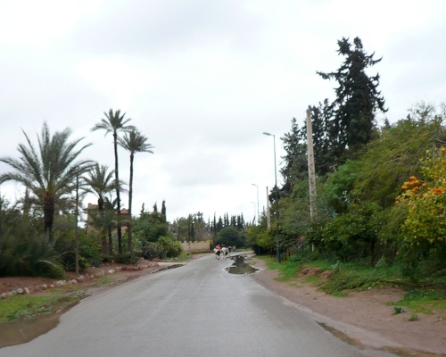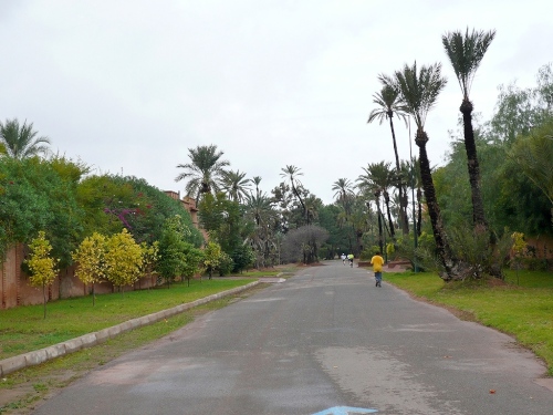 In den Jardins de l'Agdal sehen wir uralte Bäume, die bereits im 12. Jahrhundert gepflanzt wurden. In ihrer jetzigen Form wurden die Gärten im 19. Jahrhundert angelegt und mit einer Mauer eingefasst. Marrakech hat viele solcher herrlichen Grünanlagen, die mit Palmen, Granatapfel-, Orangen- und Olivenbäumen bepflanzt sind. Die Straße ist noch nass vom Regen, aber es wird langsam wärmer.