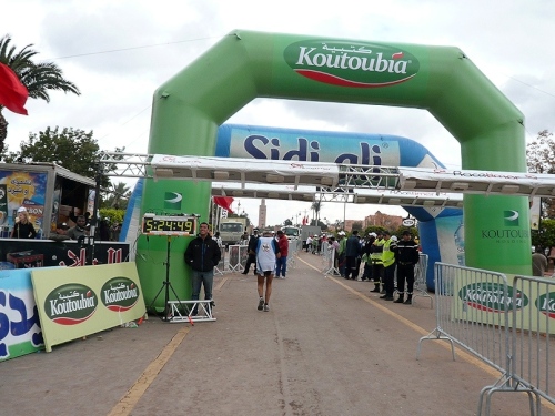 Mein Garmin zeigt mir 42,2 km an, aber noch ist kein Ziel in Sichtweite. Es geht nochmal um ein paar Ecken, dann sehe ich den Zielbogen 300 Metern vor mir. Dahinter die Koutoubia-Moschee und am Horizont die weißen Gipfel des Atlasgebirges.