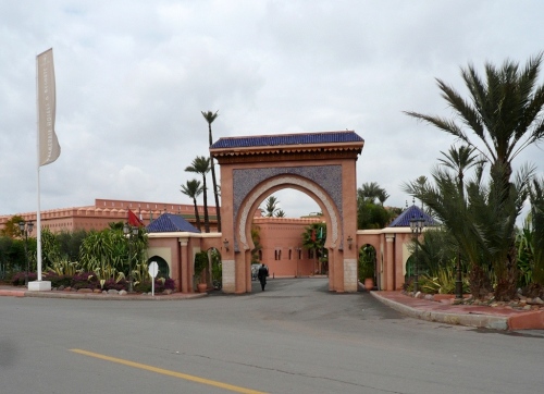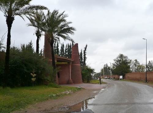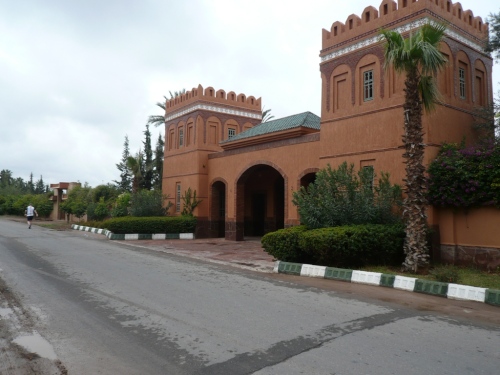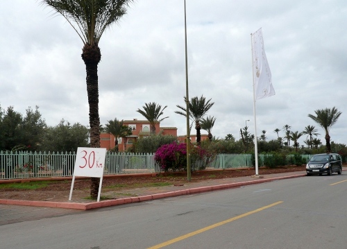Kurz vor Km 20 verlassen uns die Semis wieder und biegen ab in die Stadt. Unser Weg führt uns ein Stück über die Route des Féz. Hinter hohen Mauern verbergen sich riesige Hotelanlagen mit allem Komfort, Golfplätzen, Schwimmbädern und anderen Freizeiteinrichtungen. Die „kleineren“ Anwesen dazwischen sind die von ernstblickenden Securities bewachten prachtvolle Paläste der Reichen.