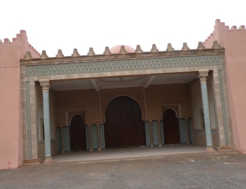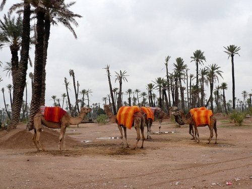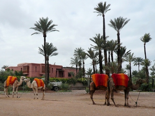 4 bis 5 Kilometer geht das so, bis wir bei ca. Km 26 an den Stadtrand die Palmerie kommen. Rechts die Stadtmauer links die Palmen. Am Straßenrand bieten in Djellabas gekleidete Männer ihre Dromedare für einen Ausritt an. Die Trampeltiere haben Sitzdecken in leuchtenden Farben und bilden so ein herrlich buntes Bild. Es erinnert an das, was Marrakesch ursprünglich einmal war: ein Karawanenlagerplatz. Der Almoraviden-Anführer Abou Bekr lagerte hier mit seinen Truppen. Sein Vetter Youssuf Ibn Taschfin baute dann die erste Moschee und Häuser (1062) und pflanzte diese riesigen Dattelpalmenhaine auf einer Fläche von 150 qkm an. Von hier aus brach er auf, das ganze Land zu erobern und Marrakesch wurde zur Hauptstadt seines Reiches.