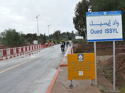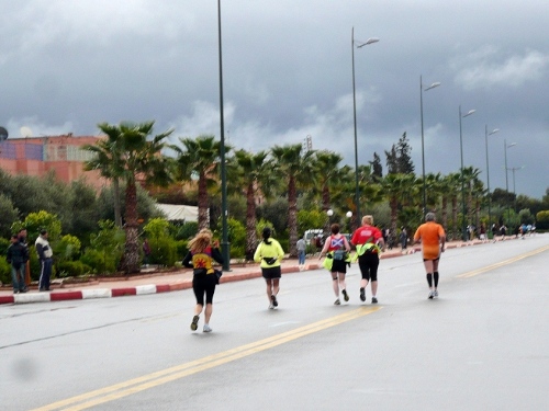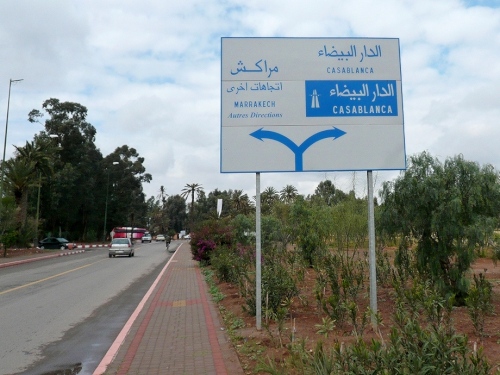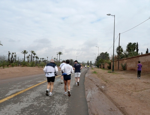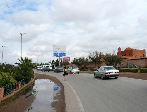 Wir laufen auf das Palmeraie Golf Palace Resort zu. Die nächsten 2km folgen wir dem Golfplatz in westliche Richtung. An der nächsten großen Kreuzung heißt es für uns über eine alte schmale Brücke Richtung Casablanca. Erst am Kreisel ändern wir unsere Laufrichtung, es südwärts Richtung Marrakech. Noch 10 km, wieder gibt es eine Kontrolle. Die Straße ist breit und der Blick schier unendlich. Die Sonne hat die Straße getrocknet, die Temperaturen erreichen so um die 18-19 Grad. Eine Fahrspur ist uns vorbehalten, trotzdem brettert hin und wieder ein stinkendes Moped an uns vorbei.