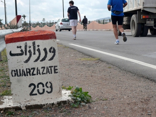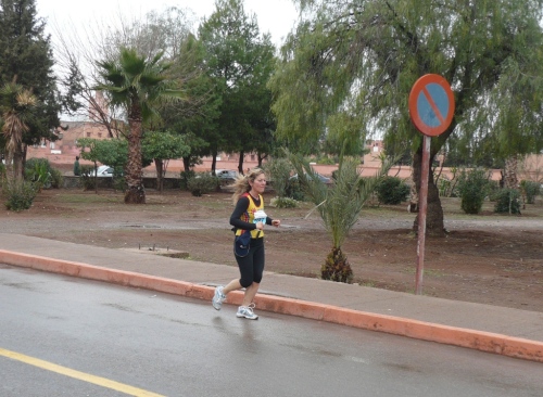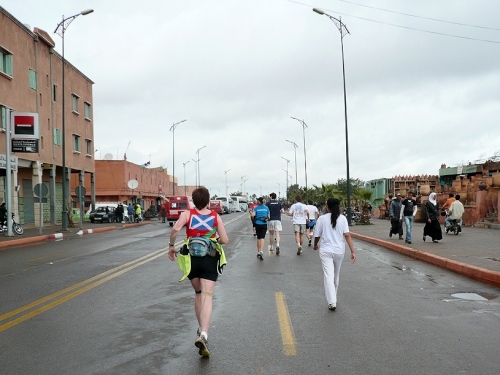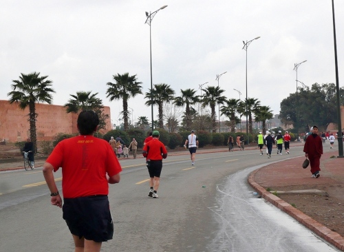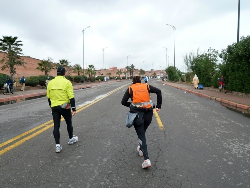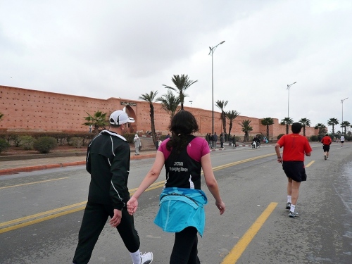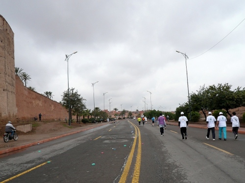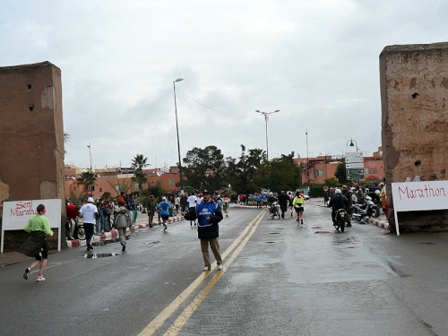 Wir laufen weiter am großen Gebetsplatz vorbei, dann haben kommt das 10km Schild und die Chipkontrolle. Einen Kilometer laufen wir entlang der Stadtmauer. Durch ein großes Tor kommen wir in die Stadt, wo uns sogleich deutliche Markierungen auf die Streckenteilung hinweisen.