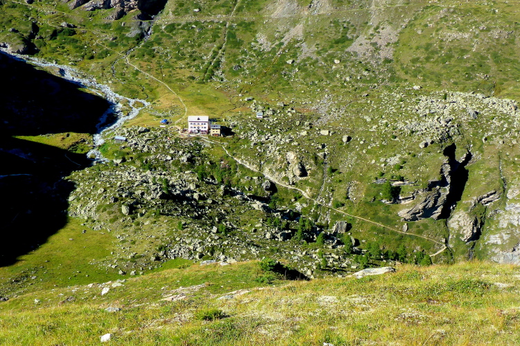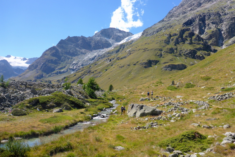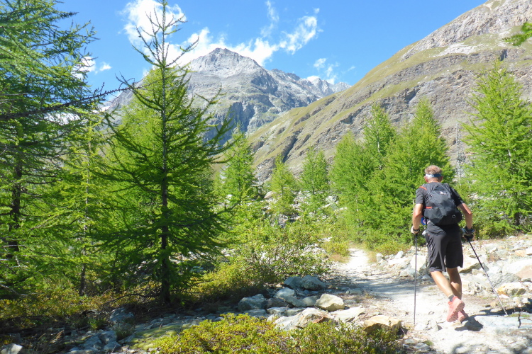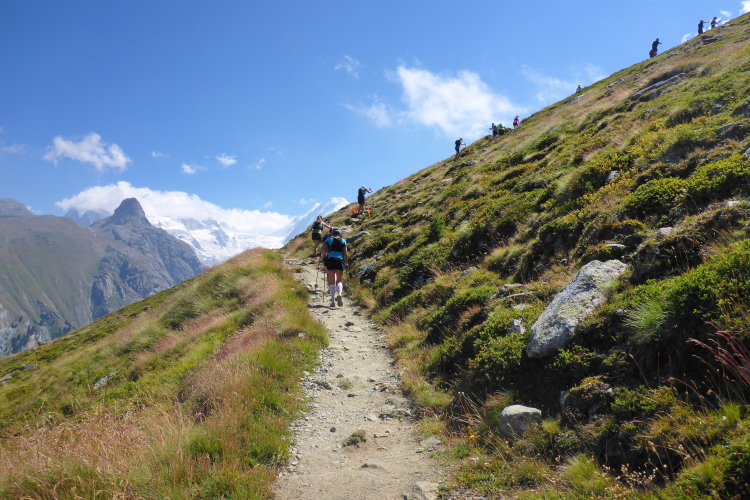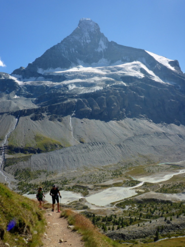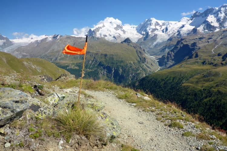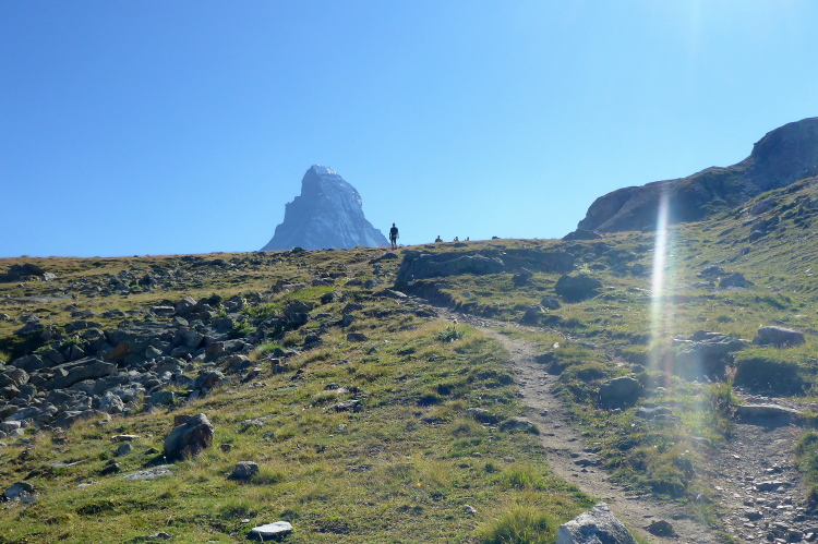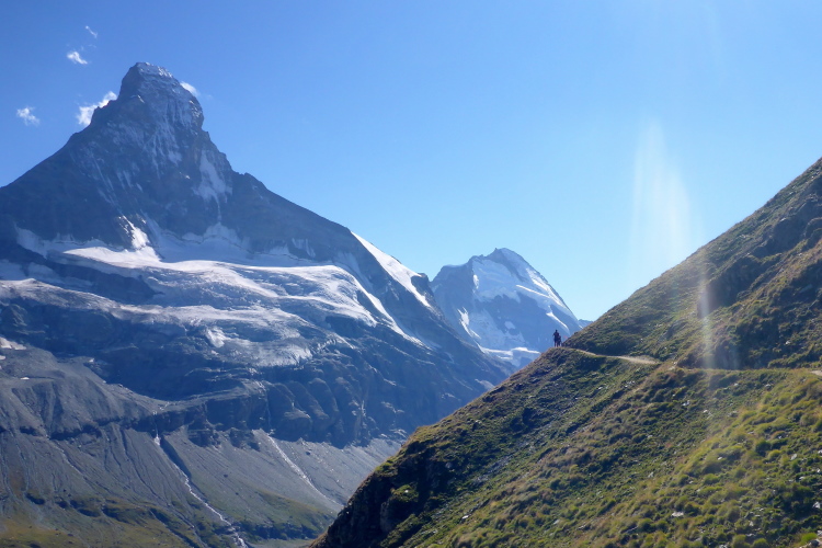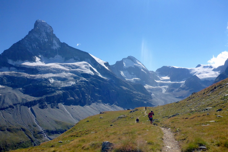 Erstmal geht es 400 Meter bergab auf die Stafelalp. Wir überqueren einen Bach und steigen wieder auf. Das Matterhorn immer an unserer linken Seite steigen wir den Talboden hoch. Vor uns schneebedeckte Viertausender. Die Strecke ist traumhaft schön. An den vielen kleinen Wasserläufen kühlen wir uns ab. Die Luft wird wieder dünner, sind wir doch auf 2700 Metern Höhe. Ein fantastischer Panoramatrail führt uns wieder zurück in Richtung Trift. Das Matterhorn liegt jetzt rechts neben uns. Vor uns, in weiter Ferne, erkennen wir die Gipfelstation der Gornergratbahn. Unvorstellbar, dass wir vor wenigen Stunden noch dort waren. Die beiden silbernen Kuppeln blinken in der Sonne.