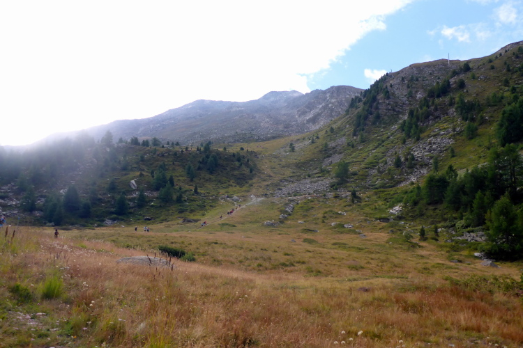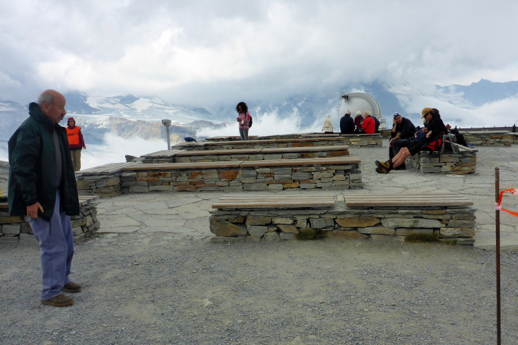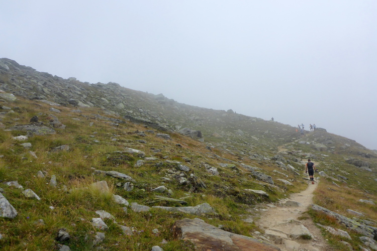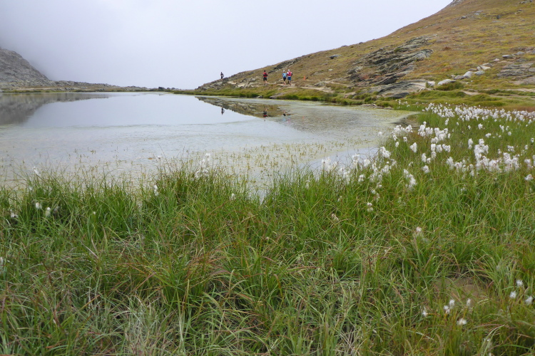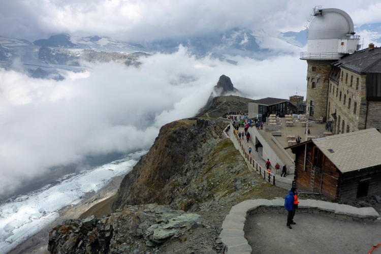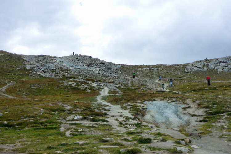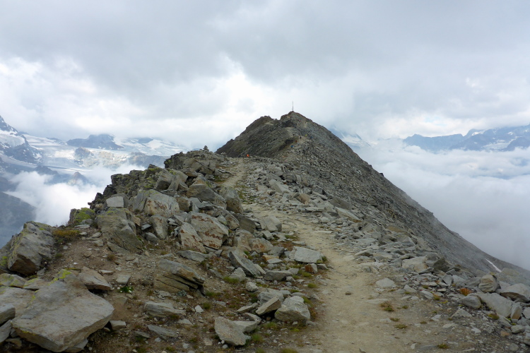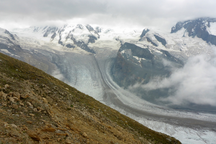 Jetzt erst mal ein Stück bergab, quasi als Anlauf für den anschließenden Weg zum Gornergrat. Nach dem kleinen Weiler Findeln geht es durch lichten Lärchenwald bergauf. Die Wolken reißen zwischendurch immer wieder auf und gewähren Ausblicke auf die uns umgebenden schneebedeckten Gipfel. Genauso schnell geht der Vorhang wieder zu und wir steigen keuchend immer weiter hoch. Schnell ist die Baumgrenze erreicht. Der Bewuchs wird immer spärlicher, bis wir nur noch Schotter unter den Laufschuhen haben. Einzelne Tropfen fallen auf den staubigen Boden. Es ist angenehm kühl. Eine Regenjacke brauche ich nicht. Für zehn Sekunden geht der Vorhang wieder auf und ich sehe schon oben, ganz weit oben, die Kuppeln der Bahnstation. Immer öfter zeigen sich blaue Streifen am Himmel. Wir kommen zum Gornergratsee. Jetzt ist es nicht mehr weit. Wir steigen rechts hoch durch ein Geröllfeld und sind auf dem Gornergrat. Die Wolken sind jetzt unter uns. Wir ziehen über den breiten Grat und genießen die Ausblicke auf die unter uns liegenden Gletscher und die uns umgebenden Viertausender. Die Diva ist leider komplett verhüllt und will sich noch nicht zeigen. An der Bahnstation ist der Verpflegungspunkt. Ein Schluck Cola muss reichen. Die Wasservorräte werden nachgefüllt und schon geht es in den Downhill. Zum Verweilen ist es zu frisch.