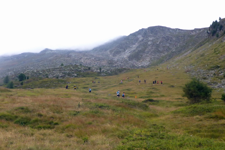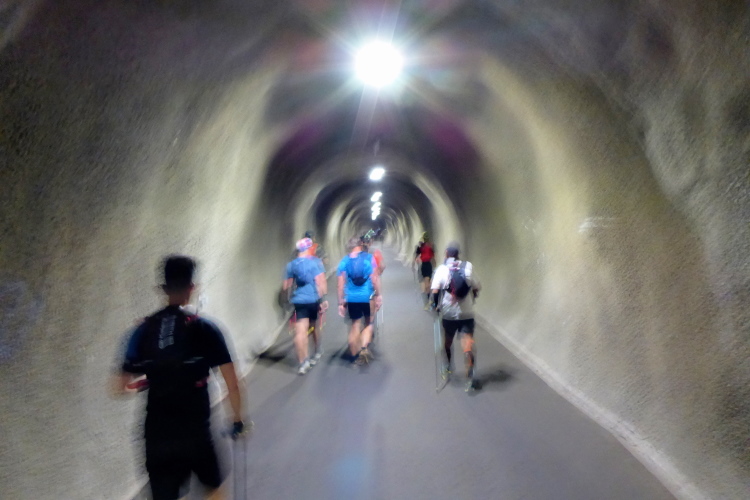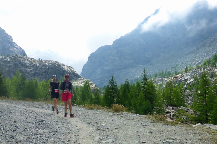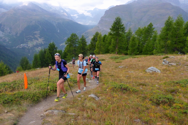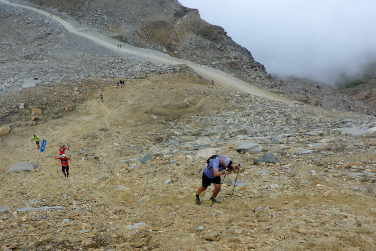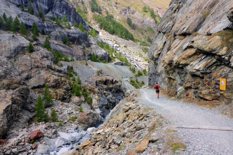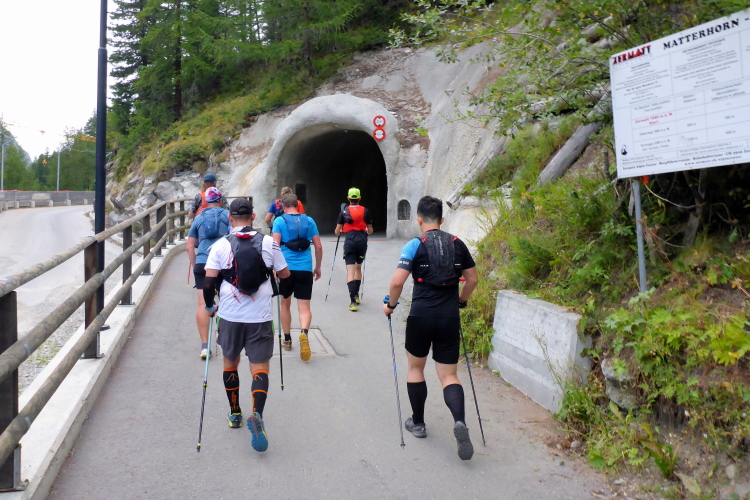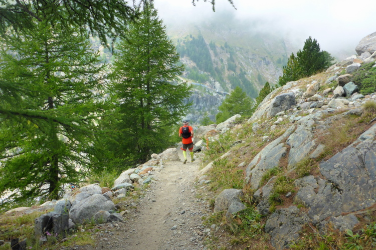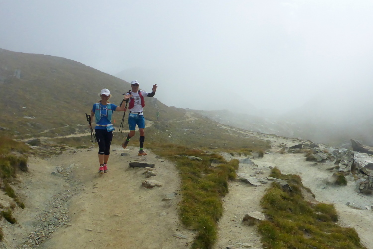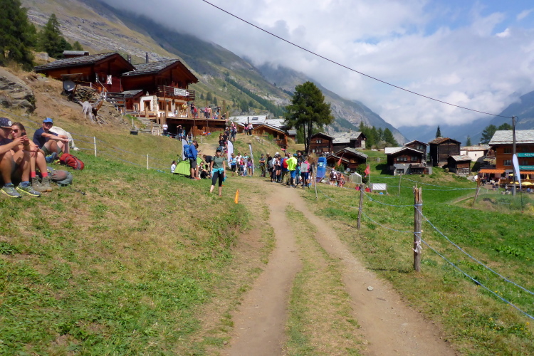 Wir laufen durch die Hauptstraße von Zermatt und werden von unseren Mädels, die später auf der 30 Kilometer Strecke starten, angefeuert. Wir erreichen die Mattervispa, den durch Zermatt fließenden Gebirgsbach. Von jetzt an geht es nur noch berghoch. Wir sind auf der gleichen Strecke, wie beim Zermatt Marathon. Auf dem breiten Fahrweg sortiert sich das Feld, bevor es auf schmalere Pfade geht. Ein felsiger Abschnitt sorgt schon gleich für Abwechslung. Die Diva versteckt sich hinter einer dichten Wolkendecke. Schade. Dafür ist das Klima perfekt zum Laufen. Oder besser gesagt zum Wandern, denn Laufen ist bei der Steigung für mich nicht mehr drin. Recht zügig bin ich in Sunegga, dem ersten Verpflegungspunkt. Ich nehme etwas Wasser und ISO und weiter geht’s.