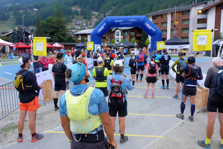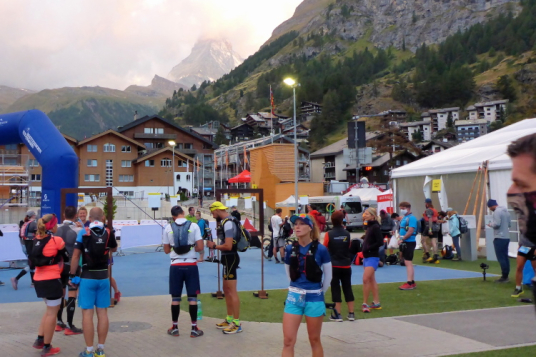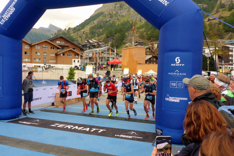 Der Blick aus dem Fenster lässt nur eine graue Wolkenwand erkennen. Kein Matterhorn in Sicht. Das Hotel hat uns das Frühstück schon um halb sechs bereitgestellt. Kalt ist es nicht und so packe ich die Regenhose nochmal aus. Wir gehen zum Startgelände, wo wir in verschiedenen Blöcken im Abstand von fünf Minuten starten werden. Das Matterhorn zeigt sich nur leicht verschleiert, aber dunkle Wolken kündigen durchwachsenes Wetter an. Ab Mittag soll es dann aber besser werden. Hauptsache es regnet nicht schon beim Start. Die Regeln werden noch einmal erklärt und schon geht es los.