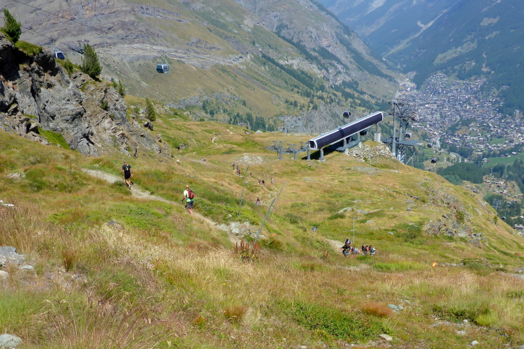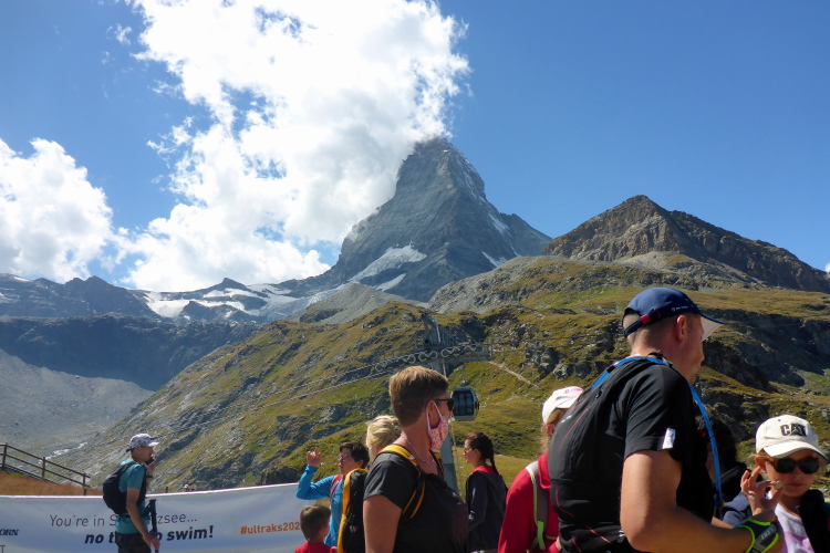 Danach folgt der lange Anstieg zum Schwarzsee. Im Briefing wurde schon davor gewarnt. Die Sonne hat nun endgültig den Kampf gegen die Wolken gewonnen und so bin ich froh, dass es zu Anfang noch etwas Schatten gibt. Stoisch stapfe ich den Berg hoch. Über uns surrt die Kabinenbahn und in der Höhe erkenne ich die Station. Leider ist es erst die Mittelstation. Ab dort sind es noch dreihundert Höhenmeter über einen Grat. Die Läuferinnen und Läufer ziehen sich wie eine Perlenkette darüber. Majestätisch zeigt sich über dem Ganzen das Matterhorn, das die Szene dominiert. Der Anblick ist einfach unbeschreiblich und lässt alle Strapazen vergessen. Die Streckenführung ist fantastisch. Trotz der Sonne ist es angenehm frisch. Wir sind auf knapp 2600 Metern und eine frische Brise tut fast so gut, wie das kalte Bier an der Schwarzseehütte. An der Verpflegung fülle ich die Vorräte auf. Ich treffe auf bekannte Gesichter und wir nehmen den Rest der Strecke gemeinsam in Angriff.