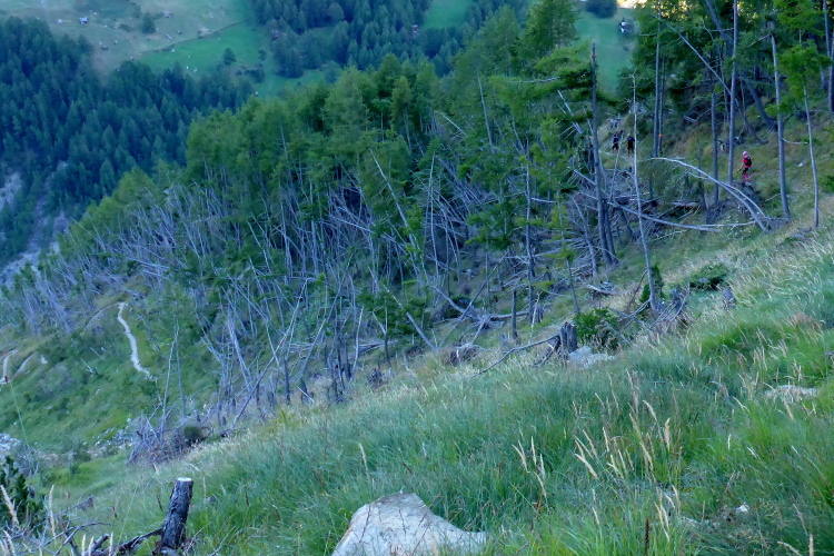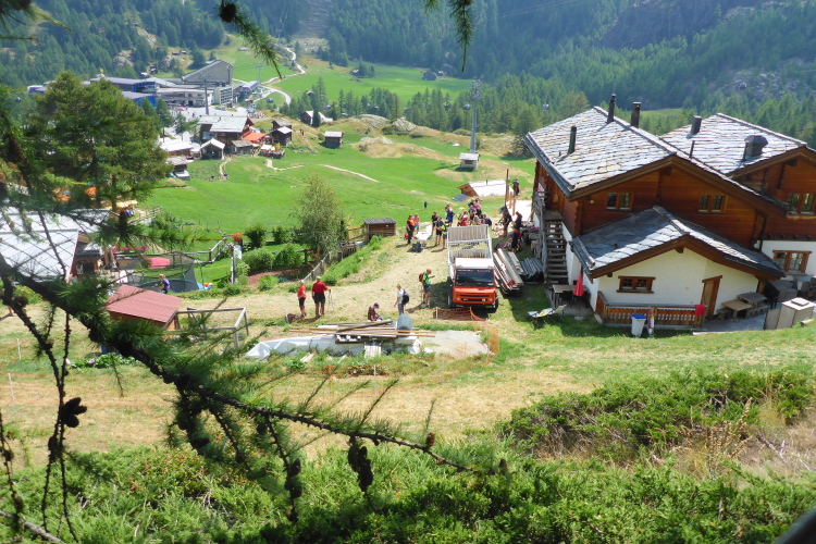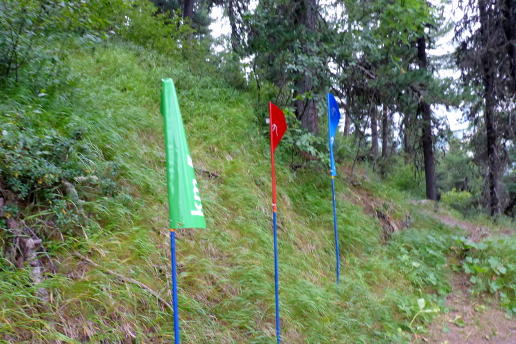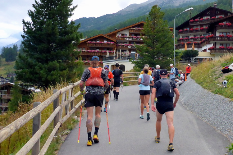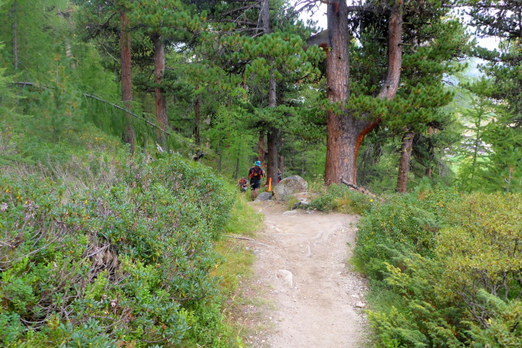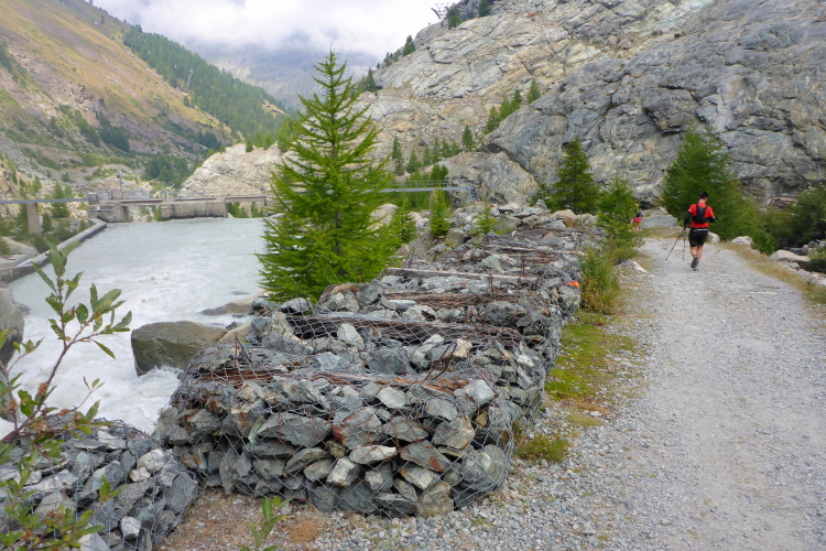 Auf gut laufbaren Wegen geht es nun 900 Meter in die Tiefe. Die Temperaturen sind ab dem Riffelsee wieder besser. Nach der Riffelalp gibt es einen kleinen Anstieg, um gleich darauf die restlichen vierhundert Höhenmeter bis nach Furi abzusteigen. Wir werden jetzt begleitet von den Läuferinnen und Läufern der 30 Kilometer Strecke. Entlang des Furggbaches erreichen wir den Gletschergarten und vorbei am Waldspielplatz erreichen wir die Hängebrücke. Fotografieren kann ich hier nicht. Zu sehr schwankt die Brücke. Nichts für zarte Gemüter. Die ganze Konstruktion schüttelt sich hin und her. Erst als weniger Personen auf der Brücke sind wird es besser.