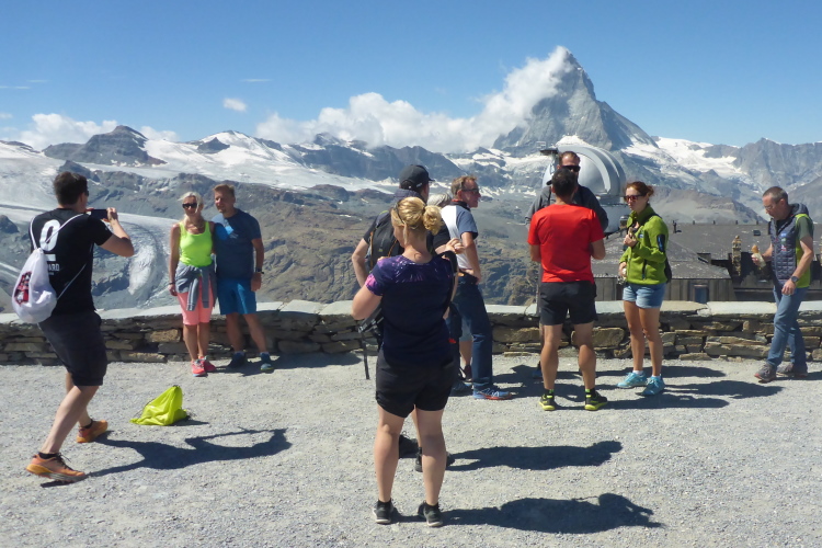 Am nächsten Morgen geht es nach dem üppigen Frühstück gleich zur Startnummernausgabe. Die Sonnen brennt vom wolkenlosen Himmel und lässt das Matterhorn in seiner ganzen Pracht erstrahlen. Eine kleine Marathonmesse verkürzt die Wartezeit und nach kurzem Anstehen haben wir unseren Startbeutel in der Hand. Darin sind ein Paar Socken und schon das Finishershirt. Kneifen geht also nicht mehr. An der Startnummer hängen drei Gutscheine für eine fünfzigprozentige Ermäßigung bei den Bergbahnen. Damit geht es gleich zur Gornergratbahn. Wir fahren mit der Zahnradbahn bis zum höchsten Punkt der morgigen Strecke, dem Gornergrat auf 3120 Meter Höhe. Wie sollte es anders sein, die Diva hat sich in ein leichtes Wolkenkleid gehüllt. Ein seitlicher Schleier zieht sich bis zum Gipfel. Für mich ist das Matterhorn einer der schönsten Berge. Umgeben von lauter Viertausendern, dominiert es majestätisch die Kulisse. Zu seinen Füßen winden sich die Gletscher, und die umgebenden Gipfel zollen schneebedeckt den nötigen Respekt.