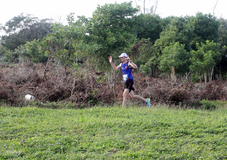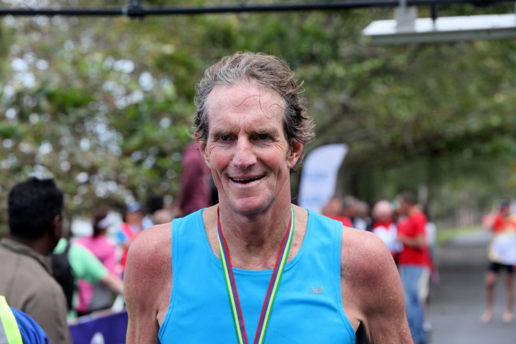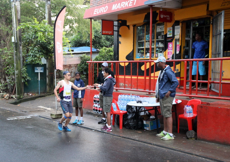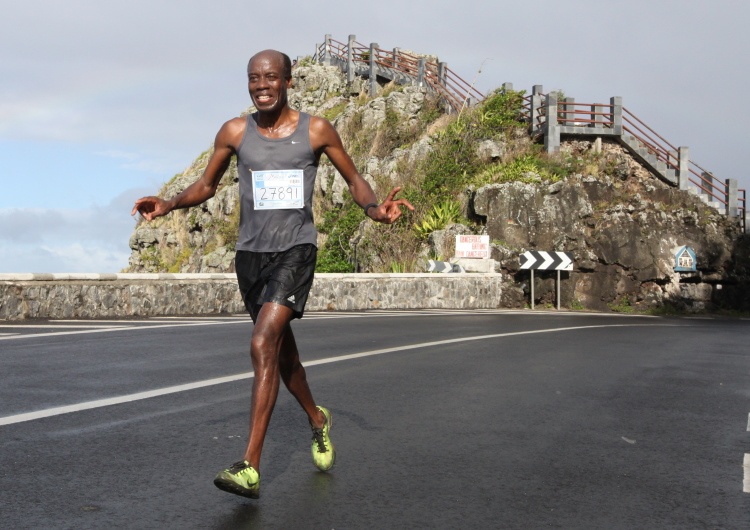 Hektik kennt man hier auf Mauritius nicht. Das steckt an. Also warte ich geduldig auf das Eintreffen von Joe. Die Siegerehrung ist voll im Gange, da sieht man ihn im orangefarbenen Diensthemd und unnachahmlichen Schritt auf das Ziel zulaufen. Die Siegerehrung wird unterbrochen, alle Läufer und Zuschauer stehen Spalier und applaudieren dem beliebten Schreiber. Das hat er wieder fein hingekriegt. Kaum im Ziel, schnappt er sich zwei der Mädels und drückt sie, klatschnass wie er ist, an sich. Naja, Joe ist heute nicht der Erste und so strahlen sie mit dem glücklichen Finisher um die Wette.
