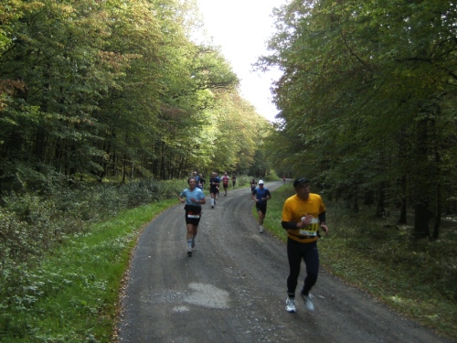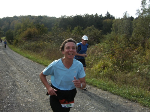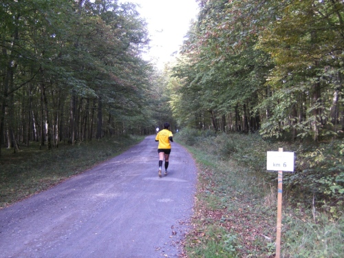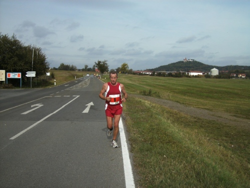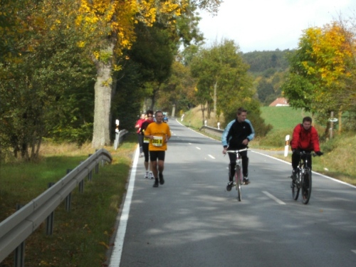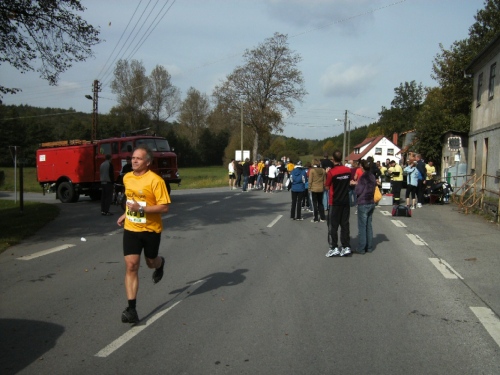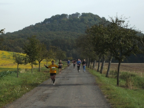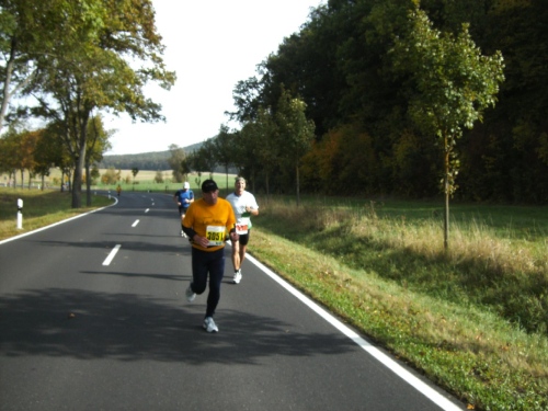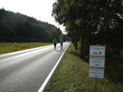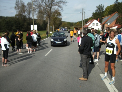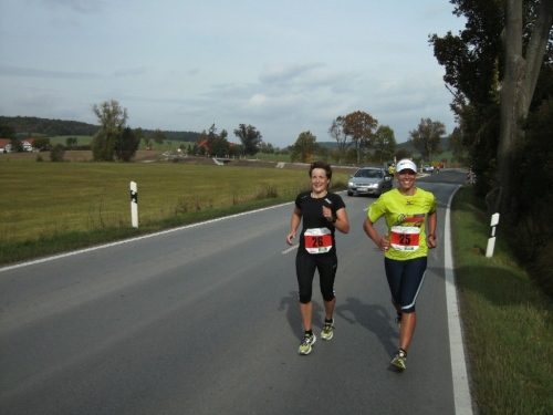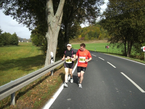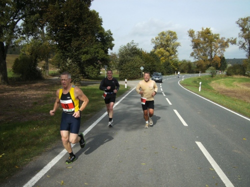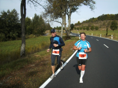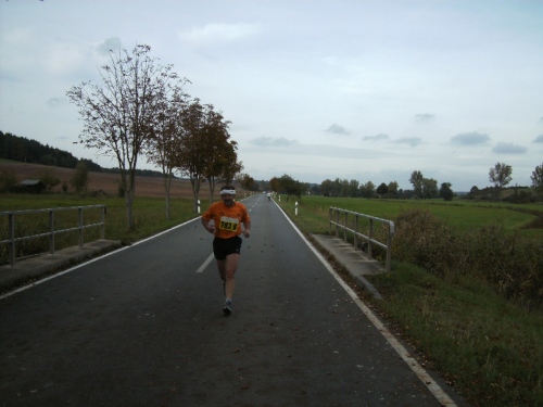 Das Feld hat sich nun schon weit auseinandergezogen. Es ist zweckmäßig, dass ich langsam beginne und dann im Laufe des Rennens immer wieder auf weitere Läufer auf- und vorbeilaufe. So finden sich Fotomodelle, für die es leider nichts zu verdienen gibt, lediglich mit Glück ein passendes Wettkampffoto. Roland Scholz und Sieglinde Mattioni sind die ersten Opfer. Die Sieglinde habe ich noch gut in Erinnerung aus dem Göltzschtalmarathon vom letzten Jahr, wo sie mit a...knappem Abstand die Frauenwertung gewinnen konnte. Wie wird es heute für sie ausgehen?