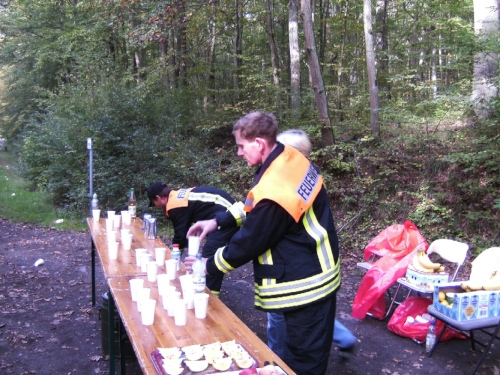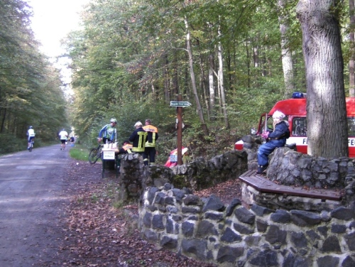 Kurz nach dem Scheitelpunkt der Steigung erwartet uns die erste V-Stelle, die von Feuerwehrmännern betrieben wird. Wasser, Iso und Obst liegen schon bereit. Später wird noch Haferschleim, Cola und Tee hinzukommen. Elf Versorgungsstationen zeigt der Streckenplan, zum Ende hin mit engerem Abstand.