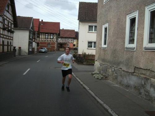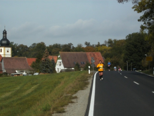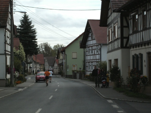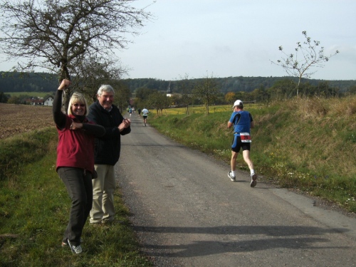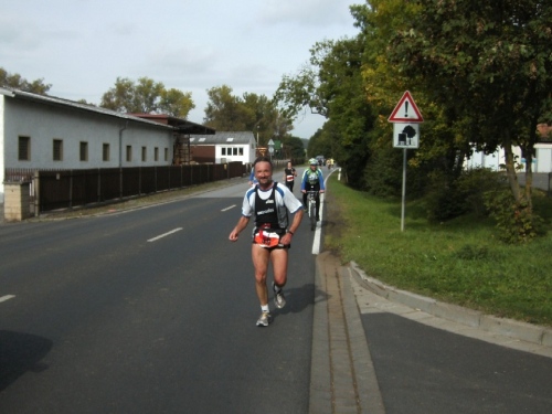 Am Ende des Gefälles geht es nach links, wo wir kurz in das Stadtgebiet Bad Rodach laufen. Viele Zuschauer werden wir heute nicht erwarten können, hauptsächlich werden an den Wechselpunkten der Staffeln, in den Ortschaften sowie am Ziel welche zu sehen sein. Diejenigen, die an der Strecke stehen, machen ihre Sache gut und feuern uns immer wieder an oder lärmen mit Rasseln.