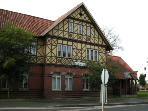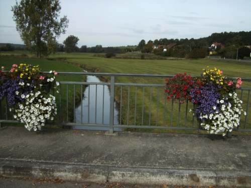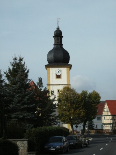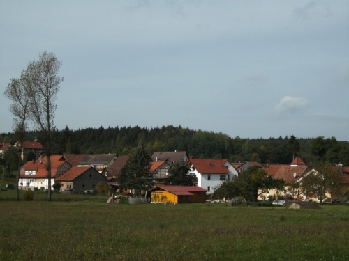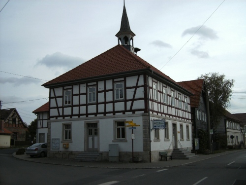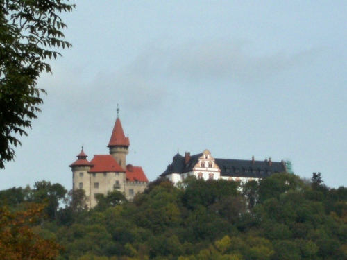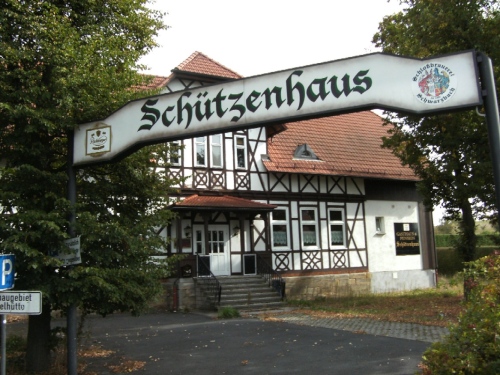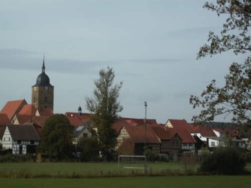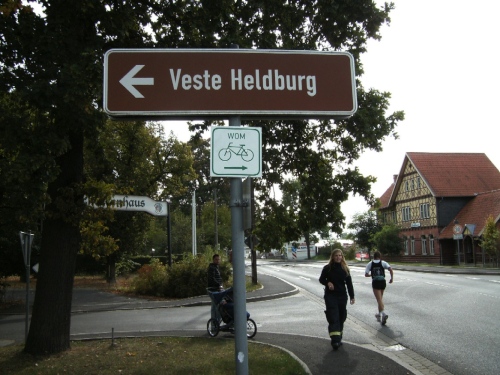 Heldburg: Wahrzeichen der Gemeinde ist die Burganlage auf der bewaldeten Bergkuppe. Von dort oben könnte man einen Blick auf den Thüringer Wald, Coburg, Rhön und zum Obermain genießen. Wir bleiben jedoch unten und haben einen schönen Blich auf den ehemaligen Bahnhof und auf das Schützenhaus. Nicht nur die beiden, sondern viele weitere Gebäude sind im fränkischen Fachwerk erbaut. Später sehe ich die Veste, quasi im Rückspiegel, ich muss mich umdrehen, im Sonnenlicht.
