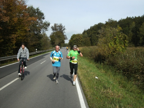 Dann sehe ich ein weibliches Doppel an der Spitze des Frauenfeldes. Katja und Mareile Hertel sind gut gestartet und wollen den Marathon unter vier Stunden finishen. Wenn mein Gefühl nicht trügt, dann geht es bei den Beiden in Richtung 3.45 Stunden. Die Mareile weiß auf jeden Fall, was sie erwartet, denn sie trägt ein Finishershirt vom Bieler 100er. Für Werner Selch ist es der erste Wettkampf nach seinem Europalauf. „So richtig zum Auslaufen“, gebe ich ihm mit auf dem Weg. Er lacht.
