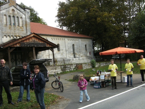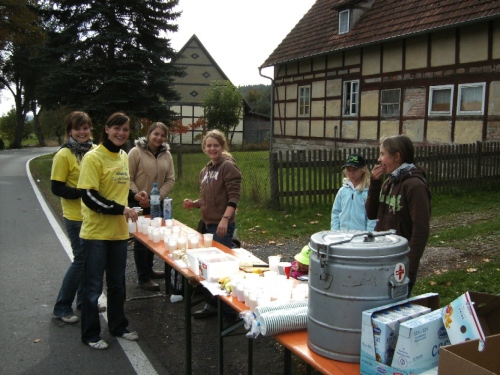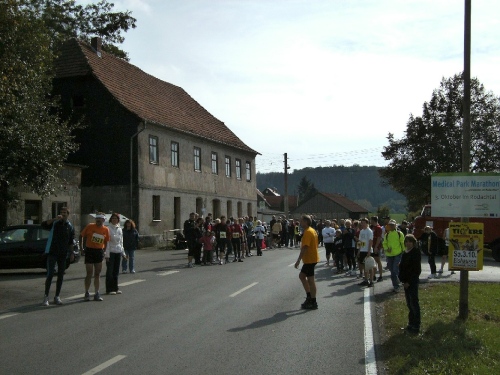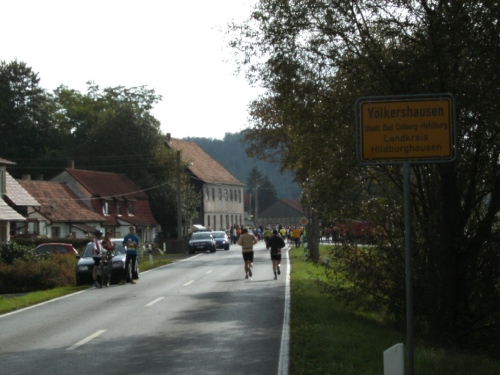 Völkershausen, Kilometer 10. Der erste Übergabepunkt der Staffeln wird einen Kilometer vorher schon angekündigt. Entsprechend viel ist dort los. Ich verpflege kurz und mache mich dann auf den Weg nach Heldburg auf.