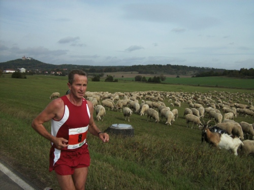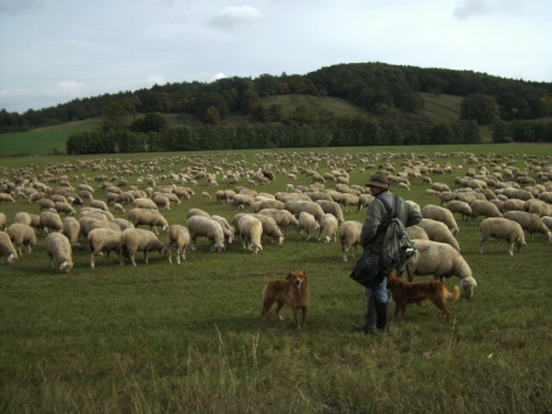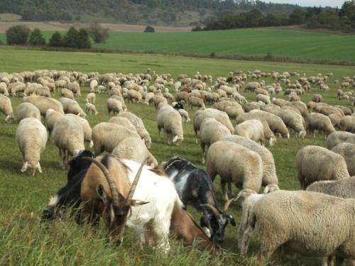 Links ist dann eine große Schafherde zu sehen. Da trifft es sich gut, dass just beim Fotoschuss Werner Dengler aus Münnerstadt durchs Bild läuft. Ein Schafbock ist auch in der Herde. Aufpassen, damit der uns nicht seine Hörner reinrennt. Böcke sind manchmal recht „hinterfotzig“, so wie wir in Oberbayern gerne zu diesen Viechern sagen.