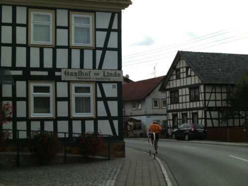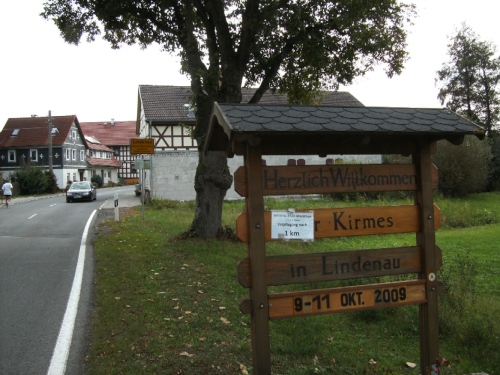 Die nächsten V-Stellen in Einöd und Lindenau werden von einigen Jugendlichen betrieben. In Lindenau zeigt eine Hinweistafel die bevorstehende Kirmes an. Wieder sind schöne Fachwerkhäuser zu sehen. Zwei Kinder lasse ich aufstellen und klatsche dann beide ab. Ich höre noch, wie beide lachenderweise im Galopp zu ihrer Mutter rennen.