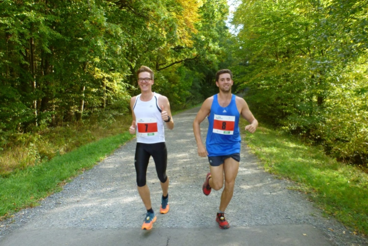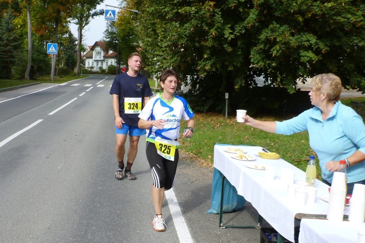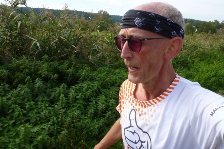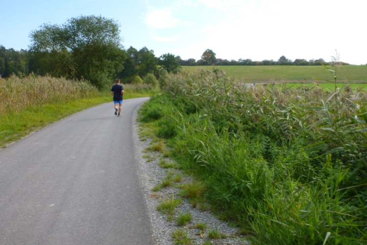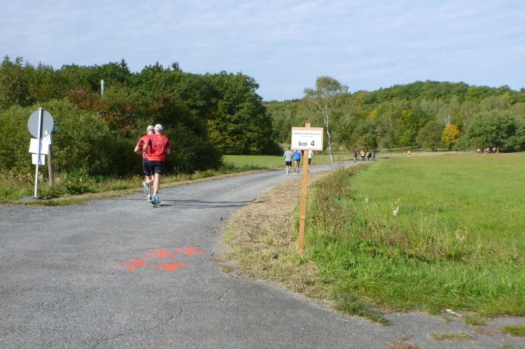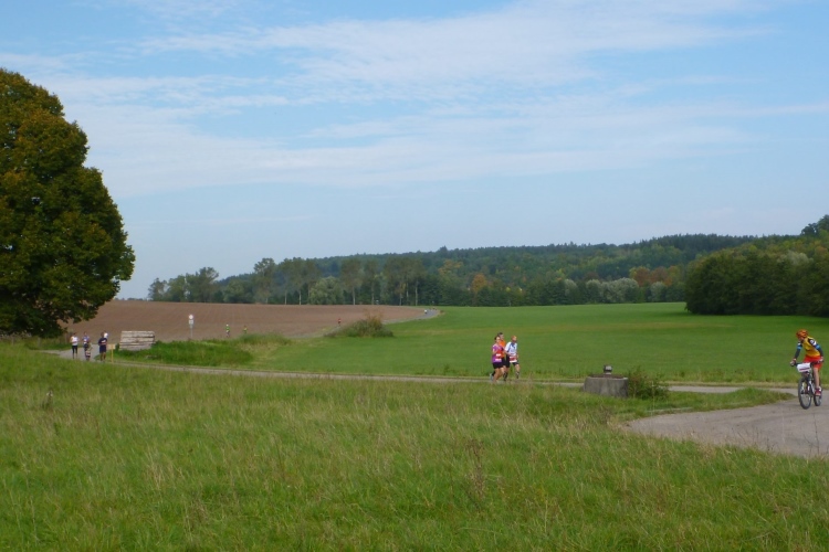 Unterhalb des Höhenzuges verläuft die jetzige Landes- und ehemalige Staatsgrenze Man muss schon genau hinschauen, um den Verlauf des früheren Plattenweg zu erkennen. Noch im Wald können wir zum ersten Mal verpflegen. Ich greife mir einen Becher Iso und laufe dann weiter. Die erlaufenen 30 Höhenmeter erhalten wir nach der Tankstelle zurück, es geht gefällig nach Seidingstadt hinunter.