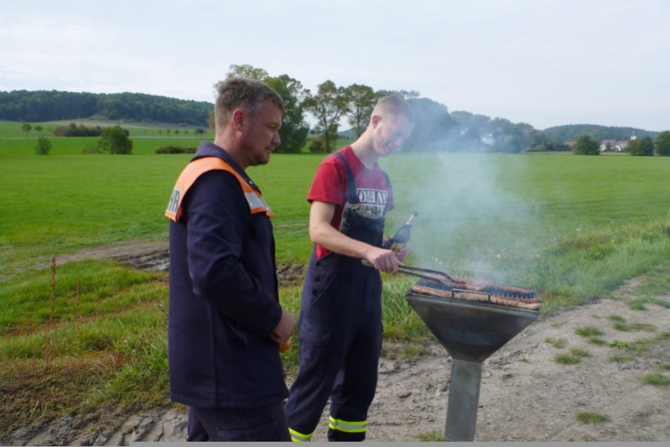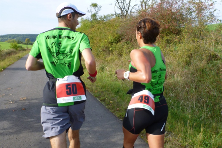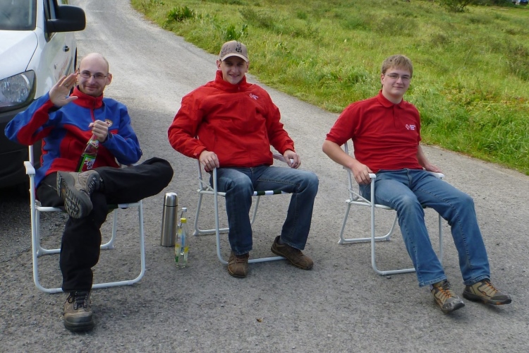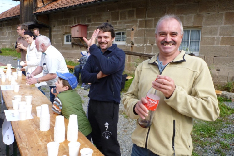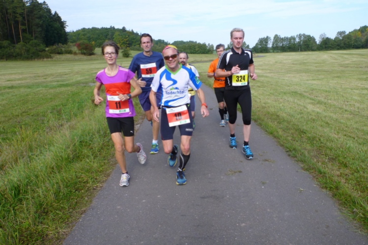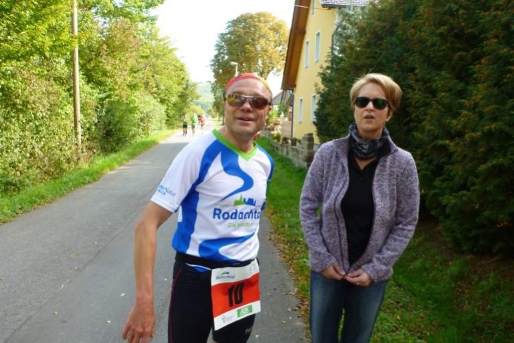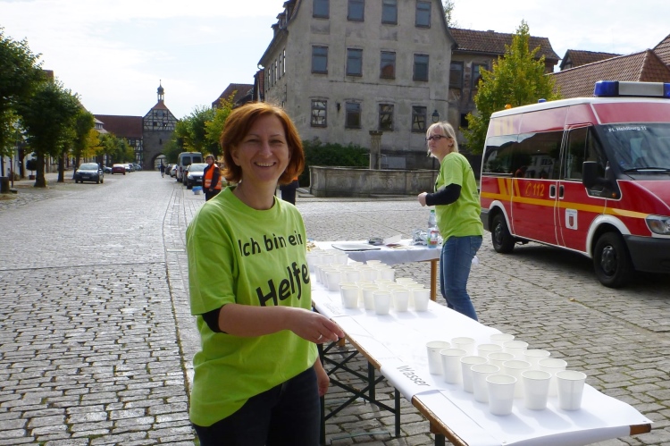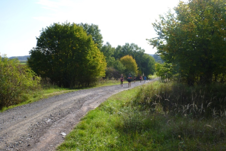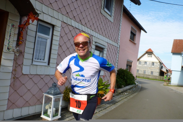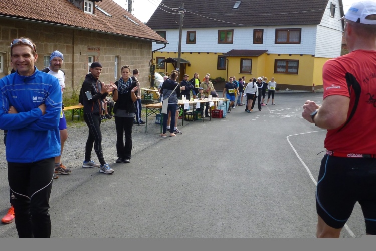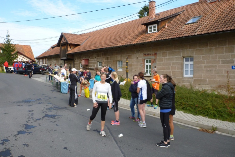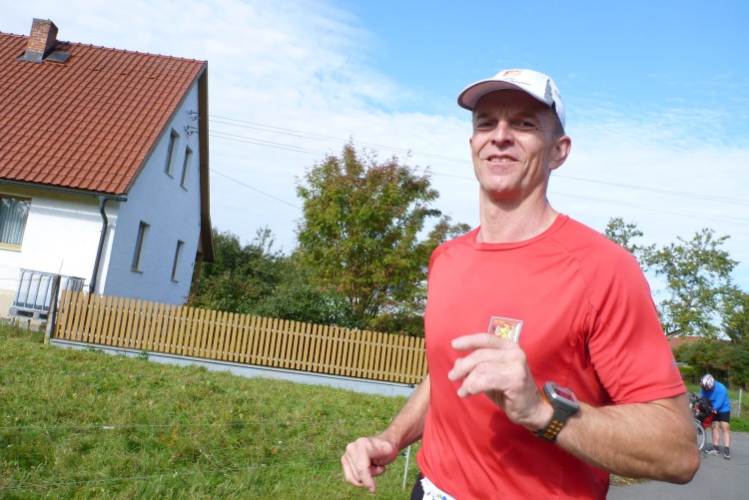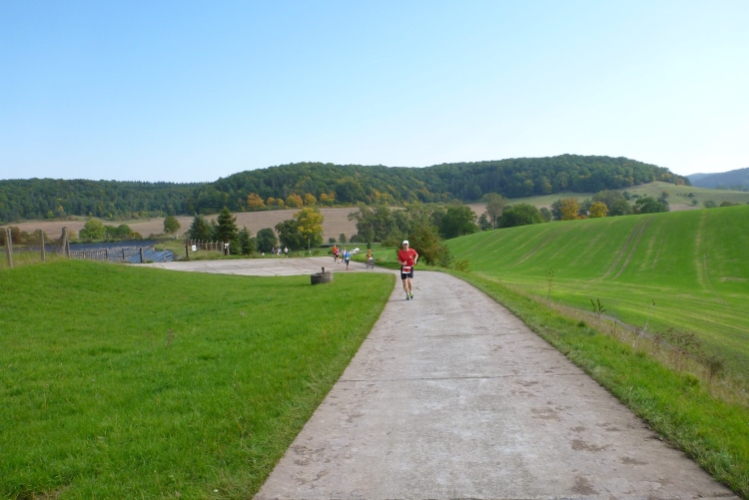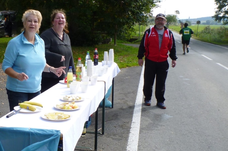 Der Staffelwechsel und die nächste Tanke werden in einem Kilometer Entfernung avisiert. Völkershausen, ein 120-Seelen-Ort. Der Empfang der Helfer und Zuschauer an der Wechselstelle ist herzlich. Ich verpflege kurz und mache mich auf den weiteren Weg, der uns später bei einem Gehöft namens Hundhauck ein paar Höhenmeter bringt. Einige im Feld legen eine Gehpause ein. Im Dunst erkenne ich in der Ferne bereits die Veste Heldburg.