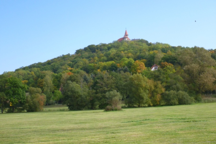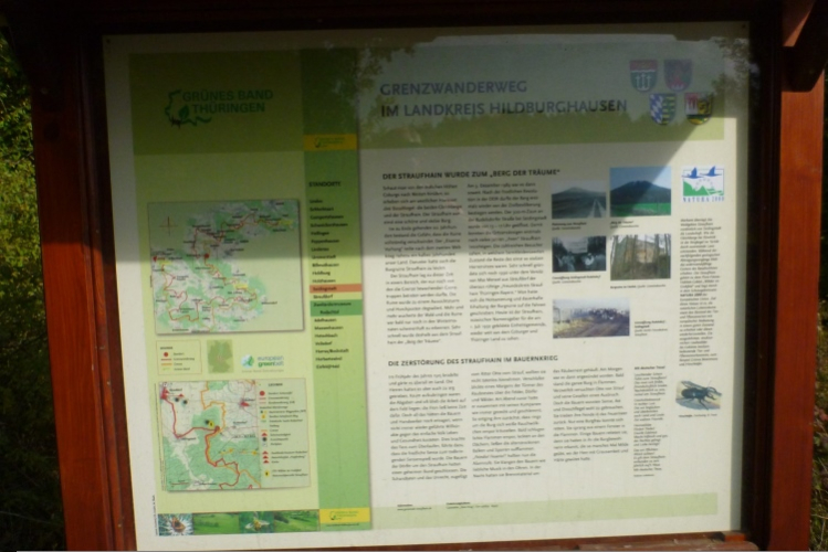 Vor uns sehe ich den knapp 450 Meter hohen Straufhain, ein Höhenzug, auf dem die Ruine der Burg Straufhain zu sehen ist. Im 16. Jahrhundert ist die Burg vermutlich zerstört worden, eine Informationstafel weiß Näheres. Demnach haben im Jahr 1525 die Herren der Burg, darunter Ritter Otto von Strauf, mit dem Bauern und Handwerkern der umliegenden Dörfern Schindluder getrieben. Die ehrenwerten Bürger mussten übertriebene Abgaben und Zahlungen aufbringen. Daher blieb die Arbeit auf den Feldern liegen, die Willkür der Herren nahm gegenüber dem gemeinen Volk weiter zu. Eines Morgens blickte der Türmer, noch schlaftrunkenen und betrunken von der Zeche der vergangenen Nacht, über die Mauern und erkannte im ersten Moment nicht, dass die Bauern die Burg angezündet hatten. Den Ausbruch der Burgherren vereitelten die Bauern mit Sensen und Dreschflegeln und trieben sie ins Feuer zurück. Lediglich eine Burgfrau konnte sich durch einen Sprung aus einem Fenster retten. Die Bauern ließen sie am Leben, denn so manches Mal hatte die Burgfrau Milde walten lassen.
