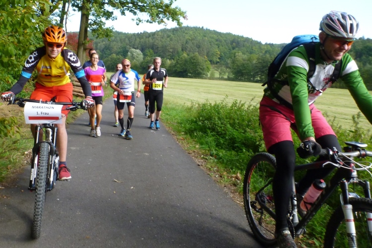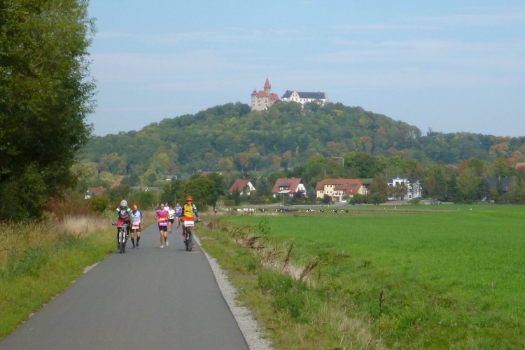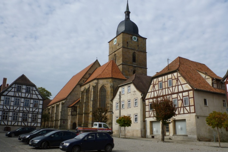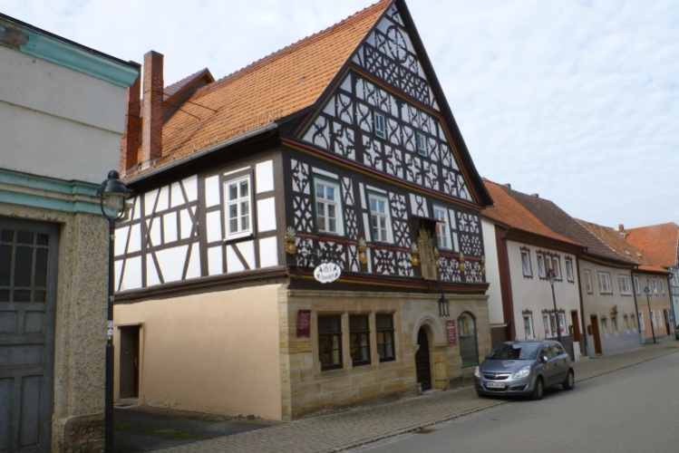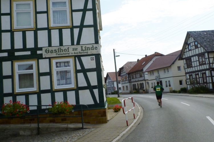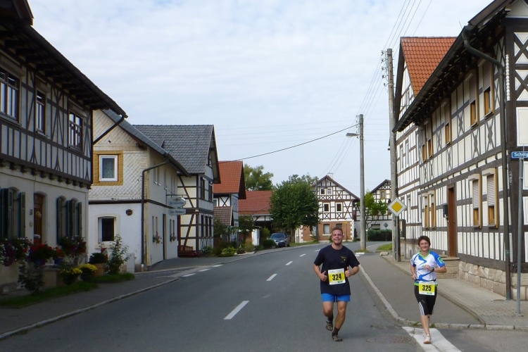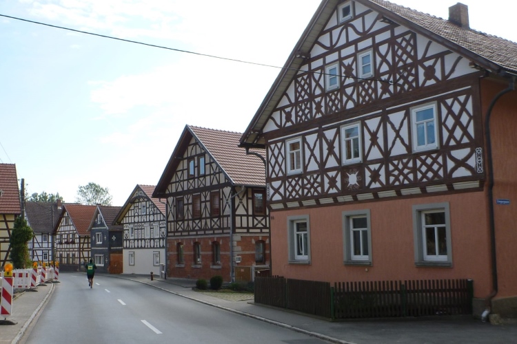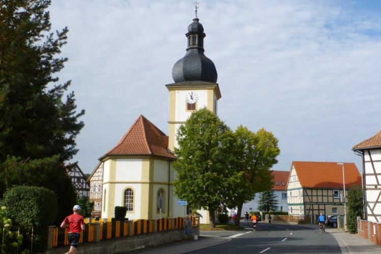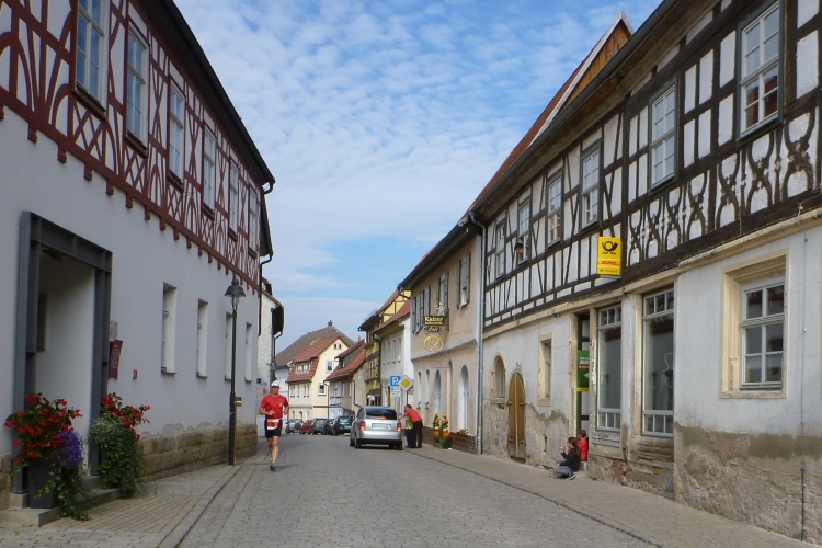 Quasi am Nebeneingang laufen wir in dem gleichnamigen Ort am Fuße der Veste ein. Früher führte der Kurs auf der Hauptstraße am Ortskern vorbei, heute geht es direkt in das Zentrum der Einheitsgemeinde Bad Colburg-Heldburg.