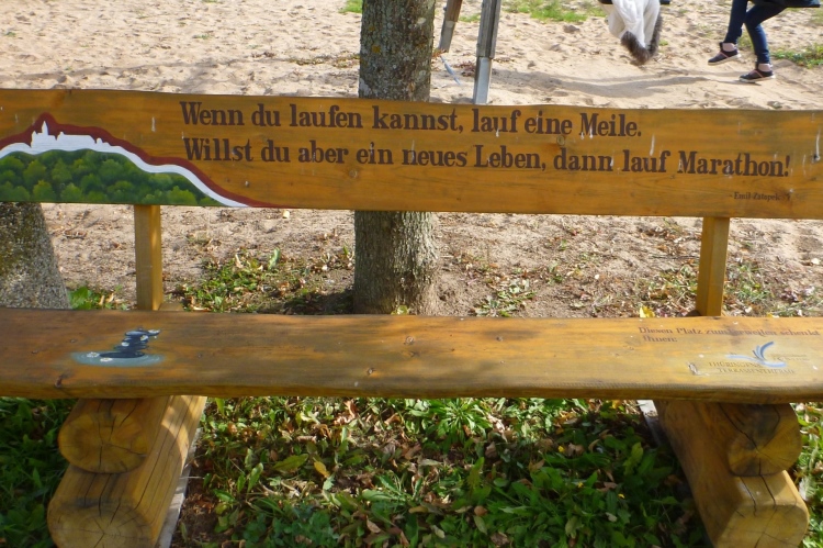 Auf einer Ruhebank kann ich noch gerade erkennen, was Emil Zatopek einmal gesagt hat: