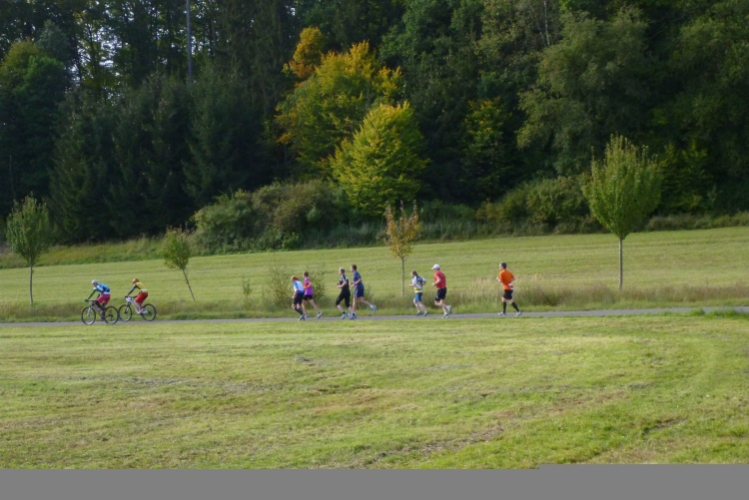 Kilometer neun. Ich bin mittlerweile auf eine kleine Gruppe aufgelaufen, darunter Bodo und Josefine. Was mich stutzig macht, sind die zwei Radfahrer, die das kleine Feld anführen. Einer hat ein Schild am Velo, das die führende Frau anzeigt. Ja, sakradi, da springt doch eine Premiereläuferin dem Frauenfeld voran.