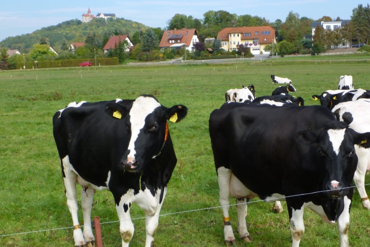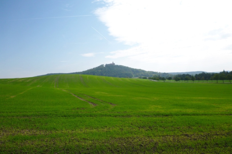 Erst beim Umdrehen auf dem folgenden Feldweg sehe ich ein wunderschönes Panorama. Ich werde von der führenden Frau mit dem ganzen Tross verfolgt und im Hintergrund thront die Veste, die gut 100 Höhenmeter oberhalb des Tales liegt. Früher hatte die Veste die Aufgabe, den Nachbarburgen Feuerzeichen in Gefahrensituationen zu geben. Ihr Name „Fränkische Leuchte“ geht wohl darauf zurück. Auf dem Turm kann man bei schönem Wetter den Ausblick zur Veste Coburg, zum Thüringer Wald und zur Rhön sowie zu den Hassbergen und dem Frankenwald schweifen lassen.