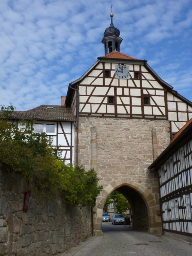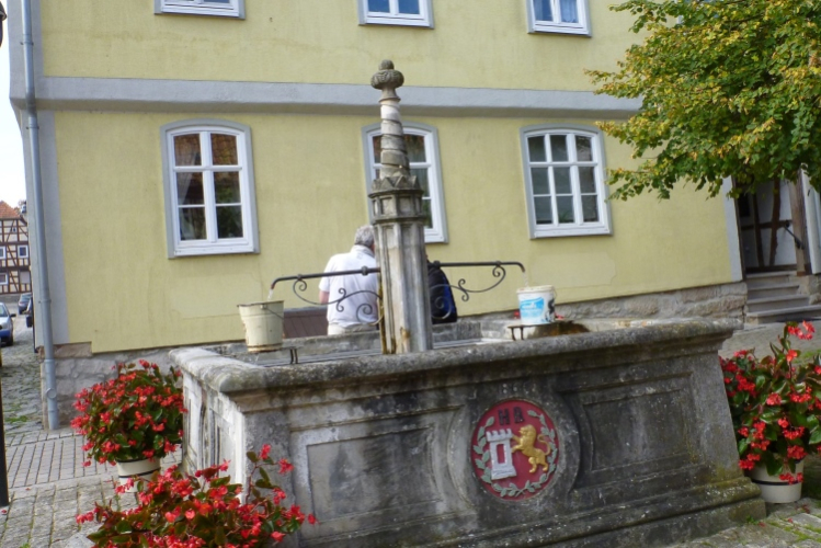 Ein Schmuckstück ist der denkmalgeschützte Stadtkern: Fachwerkhäuser, kleine Gassen, die von der Hauptstraße wegführen und wasserspeiende Brunnen. Die Stadtmauer wurde im Jahr 1402 erbaut und hatte seinerzeit zwei große Tore und 14 Türme. Heute kann man bei einem Spaziergang entlang der Mauer noch fünf erhaltene Türme sowie das Untere Stadttor sehen, durch das ich zusammen mit Andreas nach einer kurzen Verschnaufpause an einer V-Stelle Heldburg verlasse.