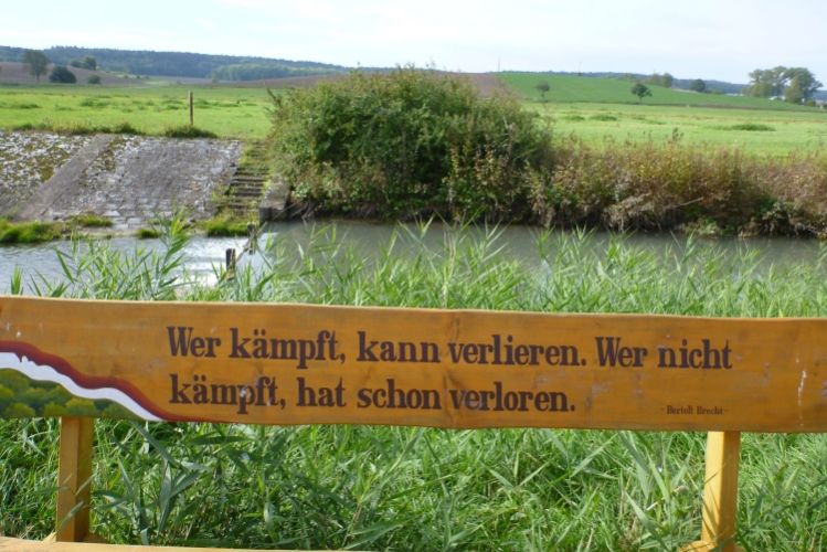 Auf einer Holzbank hilft uns Bert Brecht mit seiner Aussage weiter: „Wer kämpft, kann verlieren. Wer nicht kämpft, hat schon verloren.“ Das lässt sich auf den Verlauf eines langen Marathonlaufes eins zu eins übertragen. Rund 20 Kilometer zieht sich das Tal der Kreck in Nord-Süd-Richtung hin. Etwa beim südlichsten Punkt unserer Runde wird sie in die Rodach münden.