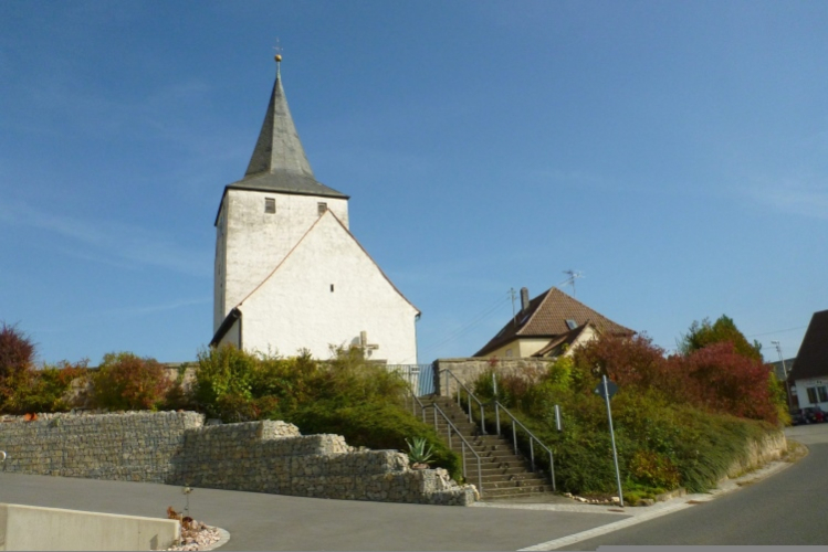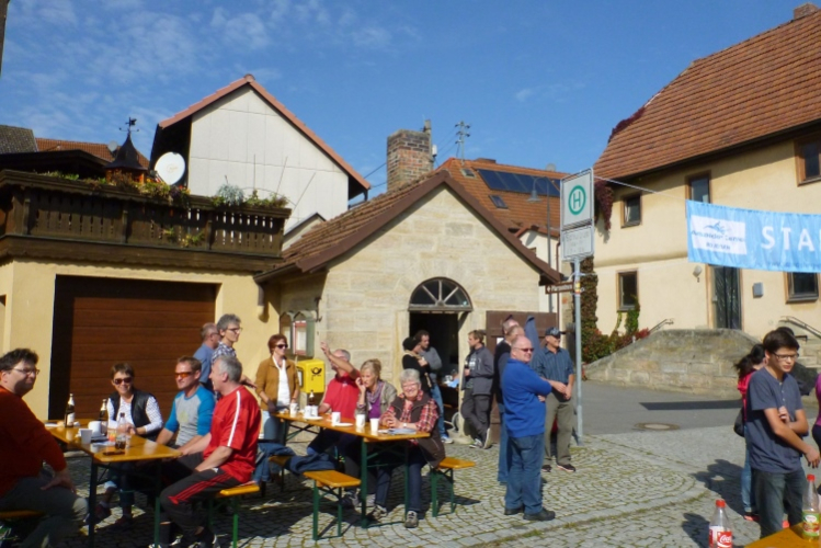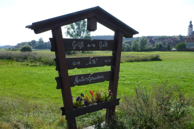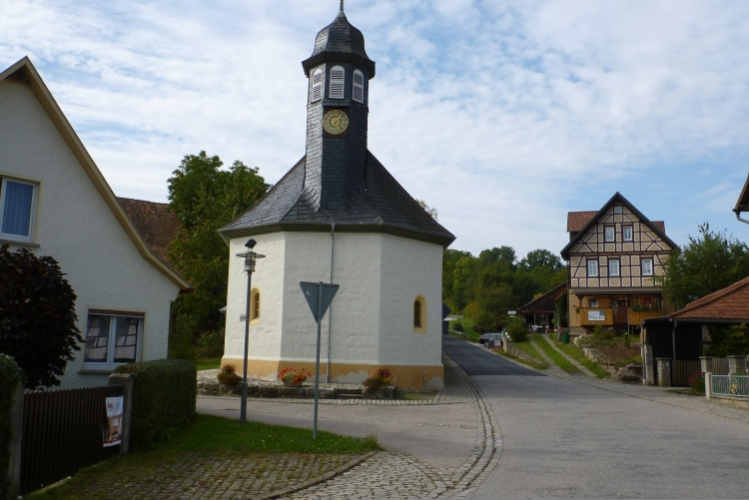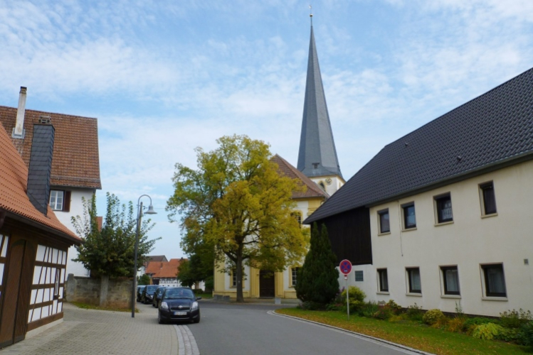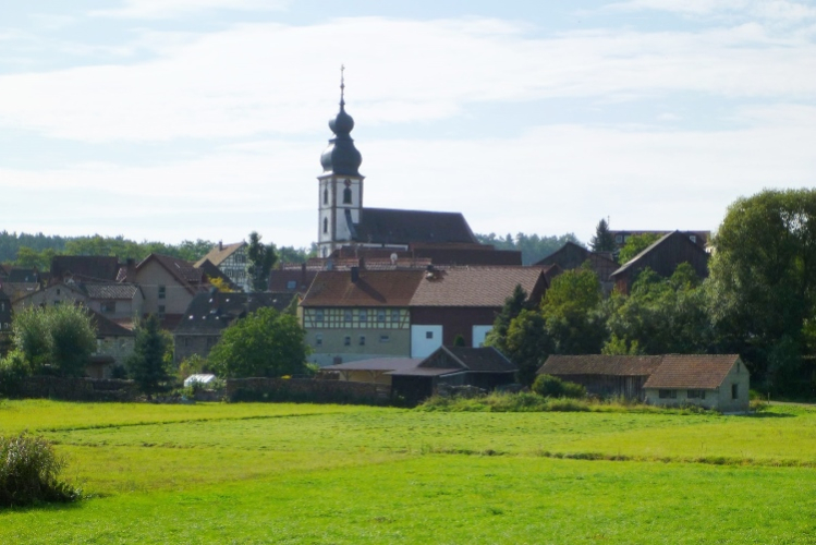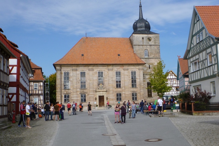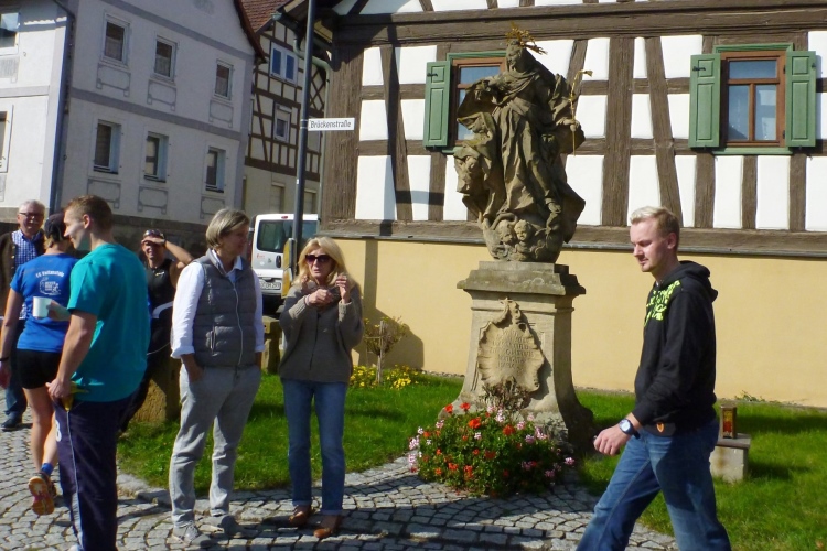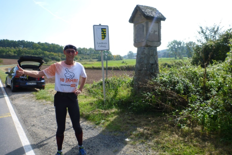 An einem Gedenkmarterl überschreiten wir wieder die Landesgrenze, die Landesstraße wird zur Staatsstraße, wir sind im Landkreis Coburg. Ein paar Bayern haben sich hier auf weiter Flur versammelt, um uns den notwendigen Drive bis zum Wechsel in Autenhausen zu geben. Der Ortsteil gehört zur Stadt Seßlach. Autenhausen hat auch eine weit in das neunte Jahrhundert zurückreichende Geschichte. Wir laufen über die Kreck hinweg und rennen in die Ortsmitte bei der barocken Pfarrkirche St. Sebastian (1774 erbaut).