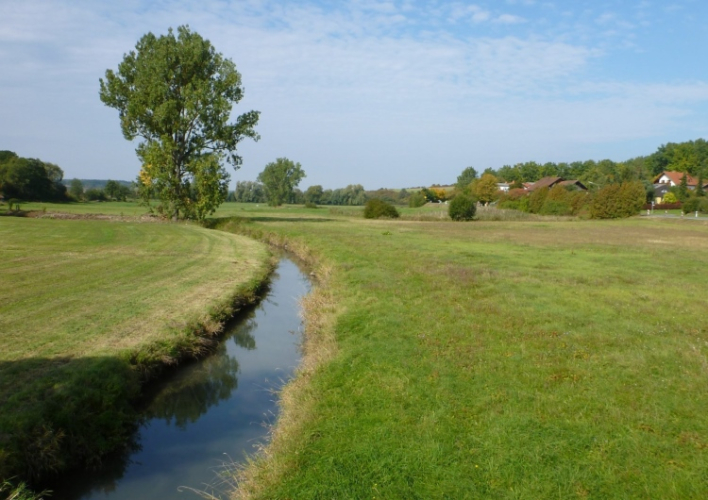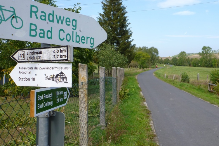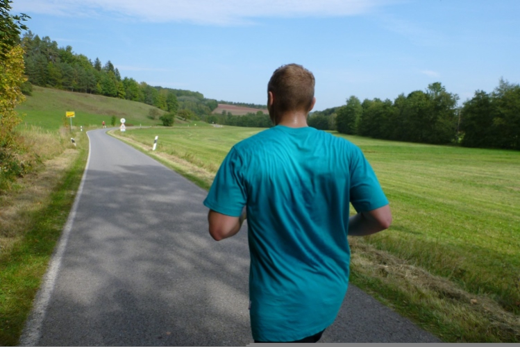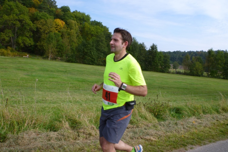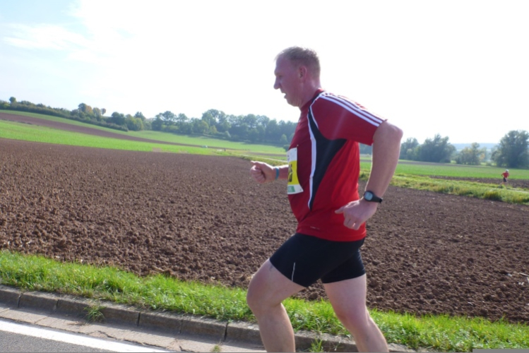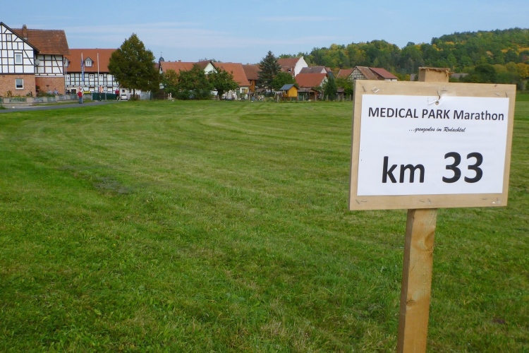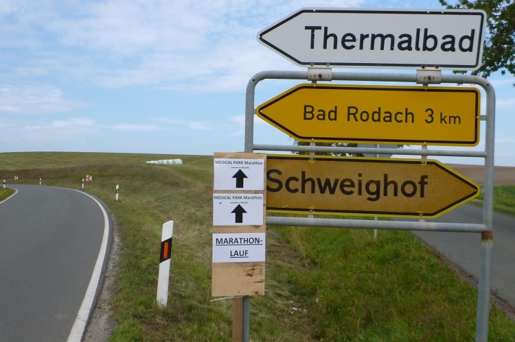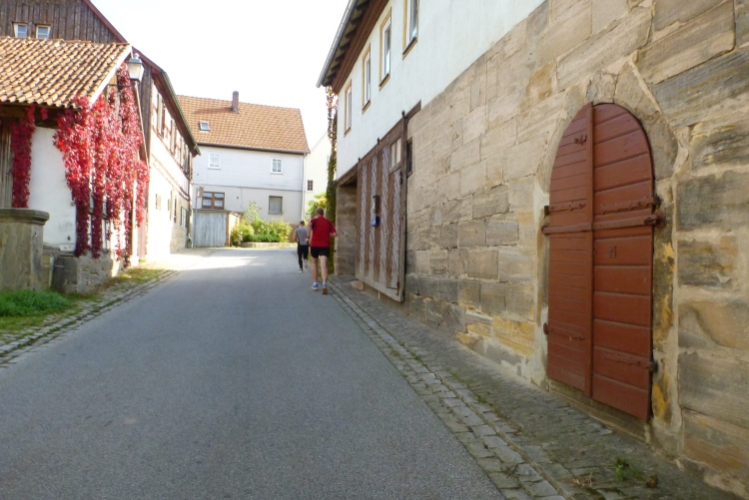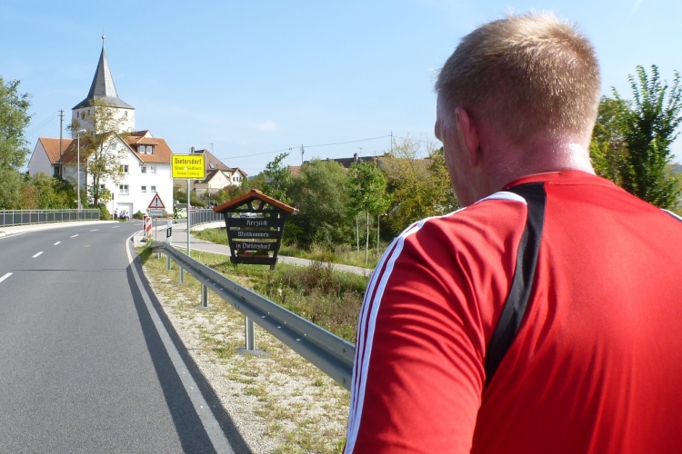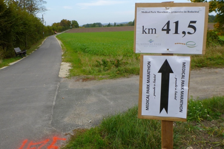 Auf einen geteerten Radweg ziehen sich die Kilometer wie Kaugummi. Kilometerschild 33 beim Ortsschild Bad Colburg, also noch neun. Mental stelle ich mir eine Trainingsrunde vor, das hilft ein wenig. Vier von 100 Einwohnern machen eigens für mich eine La-Ola-Welle. Ich laufe an der Kirche St. Katharina (aus dem 16. Jahrhundert) vorbei und schon geht es ein wenig wellig neben der 42 Kilometer langen Rodach dahin. Ein, zwei Staffeln können mich passieren.