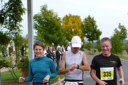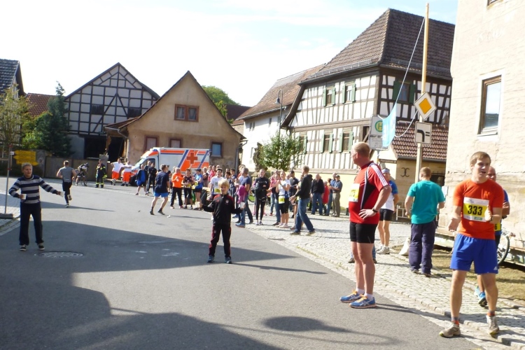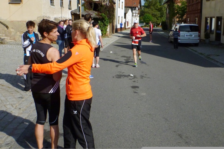 Wir überschreiten die Landesgrenze zum vierten und letzten Mal zwischen Mühlberg und Hohen Stein, Gauerstadt liegt vor uns. Der Ort ist fast ausgestorben, denn lediglich zwei Helfer am Verpflegungstisch und zwei Sanis halten Aussicht auf die Läufer. Auf meine Frage: „Gab es was zu tun?“ schüttelt ein Sani den Kopf, klatscht und meint: „Nicht mehr weit für dich“.