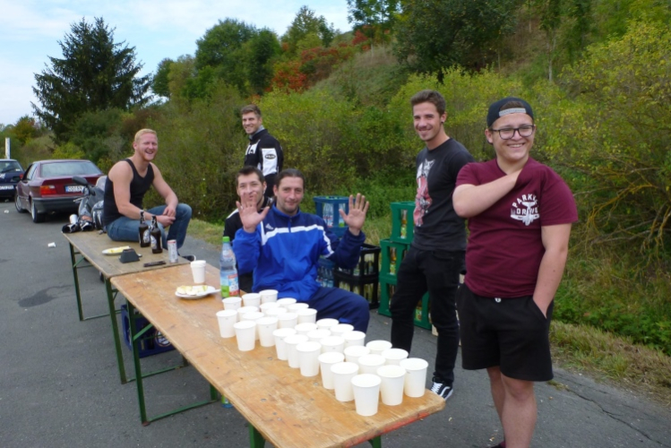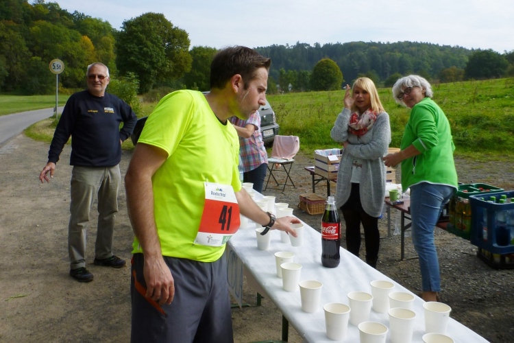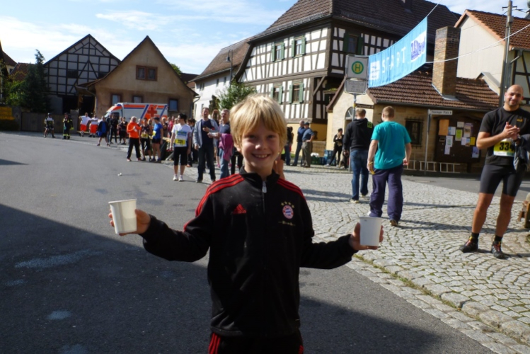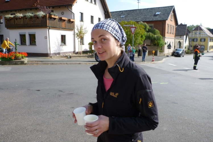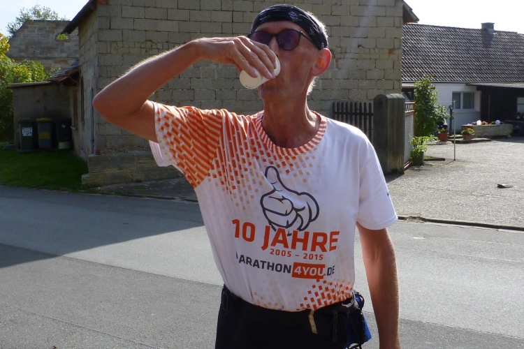 Es wird zäh auf der Kreisstraße nach Bad Rodach. Unterhalb des Gauerstädter Berges der letzte Trank einen Kilometer vor dem Finish. Man versucht, mir ein Wasser anzudrehen. Mein Bierwunsch wird nicht wahrgenommen. Erst als ich auf die Flasche Bier deute, lässt man mich einen Zug machen.