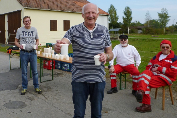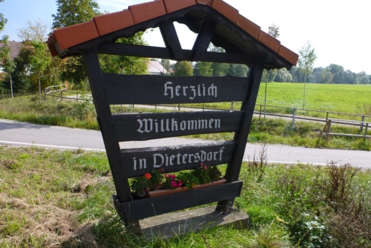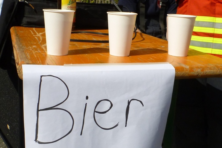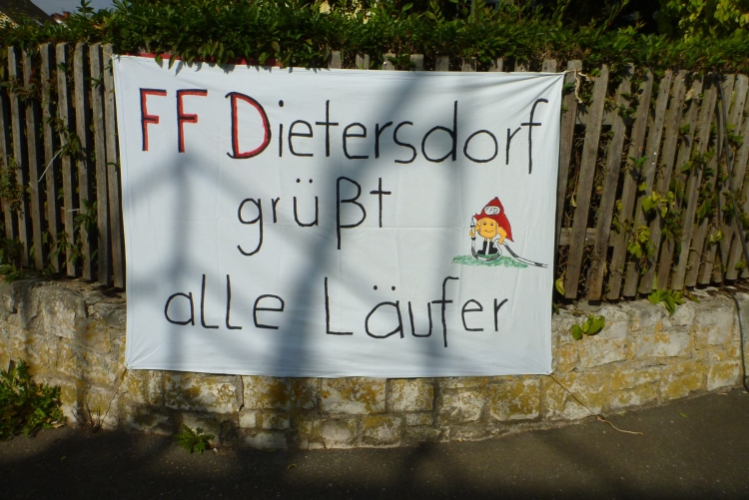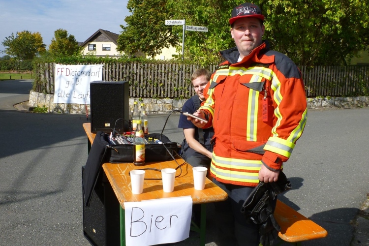 In Dietersdorf dreht sich unsere Laufrichtung an einer weiteren Tanke, die unterhalb der katholischen Kirche St. Kilian aufgebaut ist. Dann höre ich Musik von Wencke Myhre: „Er hat ein knallrotes Gummiboot“. Dass ausgerechnet die Jugendfeuerwehr sich diesen Uralt-Schlager ausgesucht hat? Immerhin bekomme ich an ihrer privaten bayerische Versorgungsstation endlich das Festbier am Festtag. Die Burschen grölen, als ist den Becher in einem Zug leere. Man will mir noch etwas mitgeben, gegen den Durst.