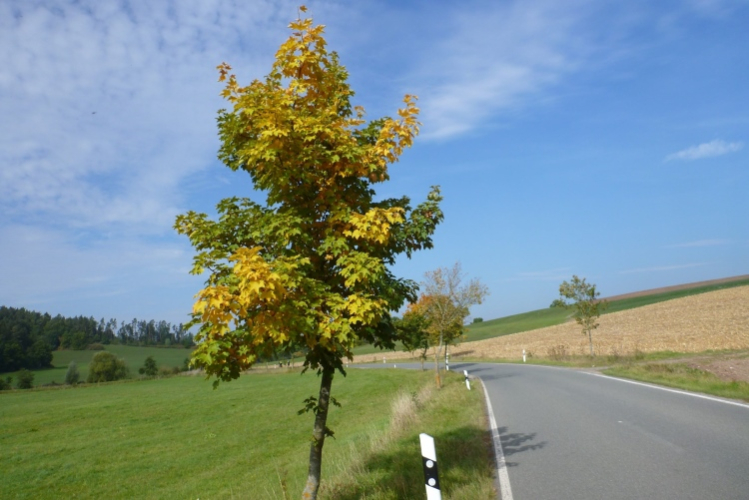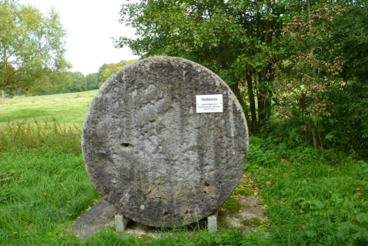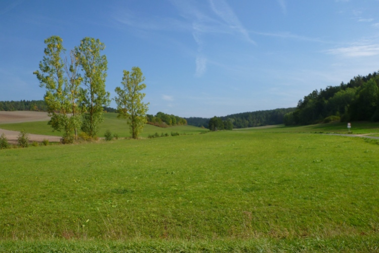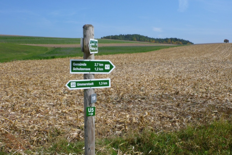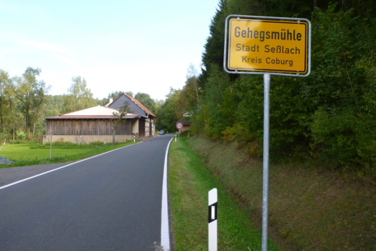 Zuerst laufen wir auf leicht hügeligem Terrain östlich von Gemünda durch die Flur, dann biegen wir auf eine Kreisstraße ein, die uns zur Gehegsmühle bringt. Hier überlaufen wir die Landesgrenze zu Thüringen. Ich kann aber den Grenzverlauf nicht erkennen, beiderseits ist Wald.