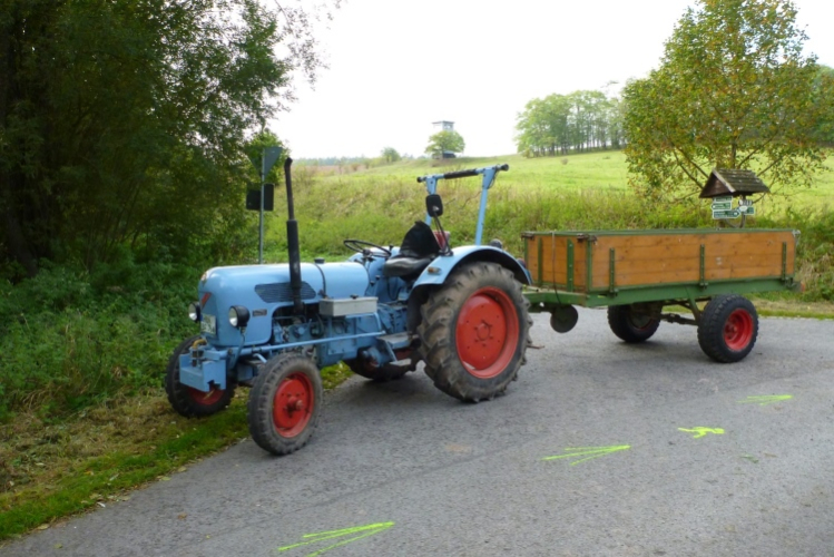 Weiter laufen wir jetzt auf einem Radweg, der uns nach Gemünda bringt. Die evangelisch-lutherische Pfarrkirche ist ein spätmittelalterlicher Bau aus dem Jahr 1515. An einer Einkehrstätte hat jemand einen Original U.S. Army Jeep geparkt.